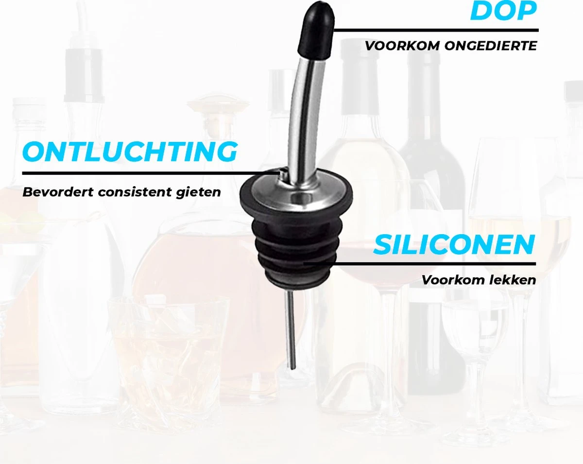 Dankzij de rubberen randen passen deze schenktuiten op iedere fles. Ze zijn uiteraard ideaal voor bars en restaurants, maar komen ook goed van pas in huis of tijdens feestjes! Gebruik ze om de lekkerste cocktails te maken, of verrijk je lievelingsgerecht met de juiste hoeveelheid azijn of olijfolie!