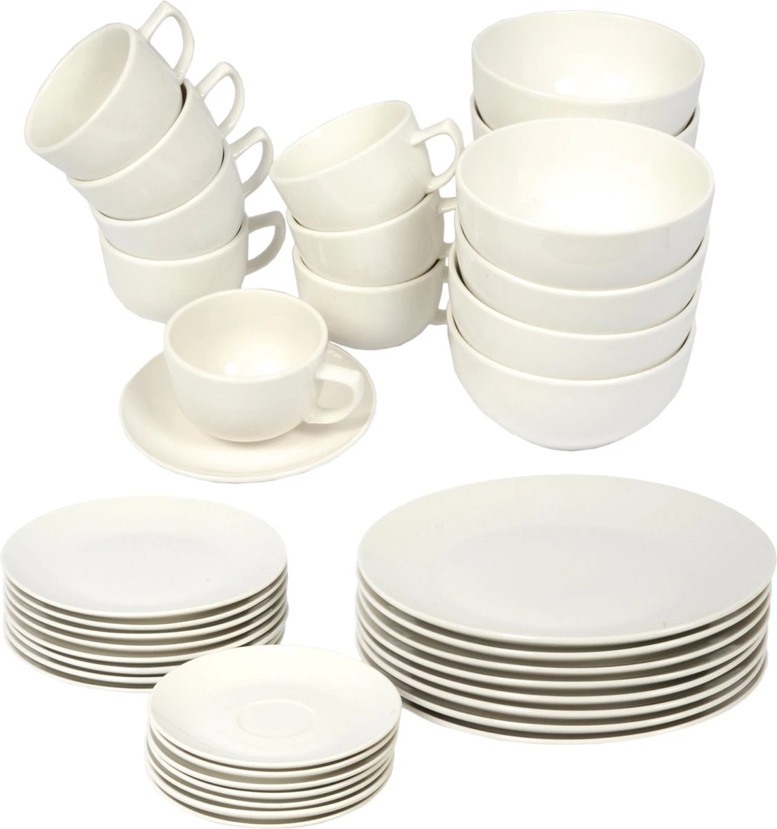 Het 8-persoons servies heeft een witte kleur, ronde vorm en neutrale uitstraling. Alle aandacht gaat daarmee naar je gerechten. Bovendien sluit het hierdoor prima aan bij eventueel ander serviesgoed dat je hebt. Zo kun je het gemakkelijk combineren.