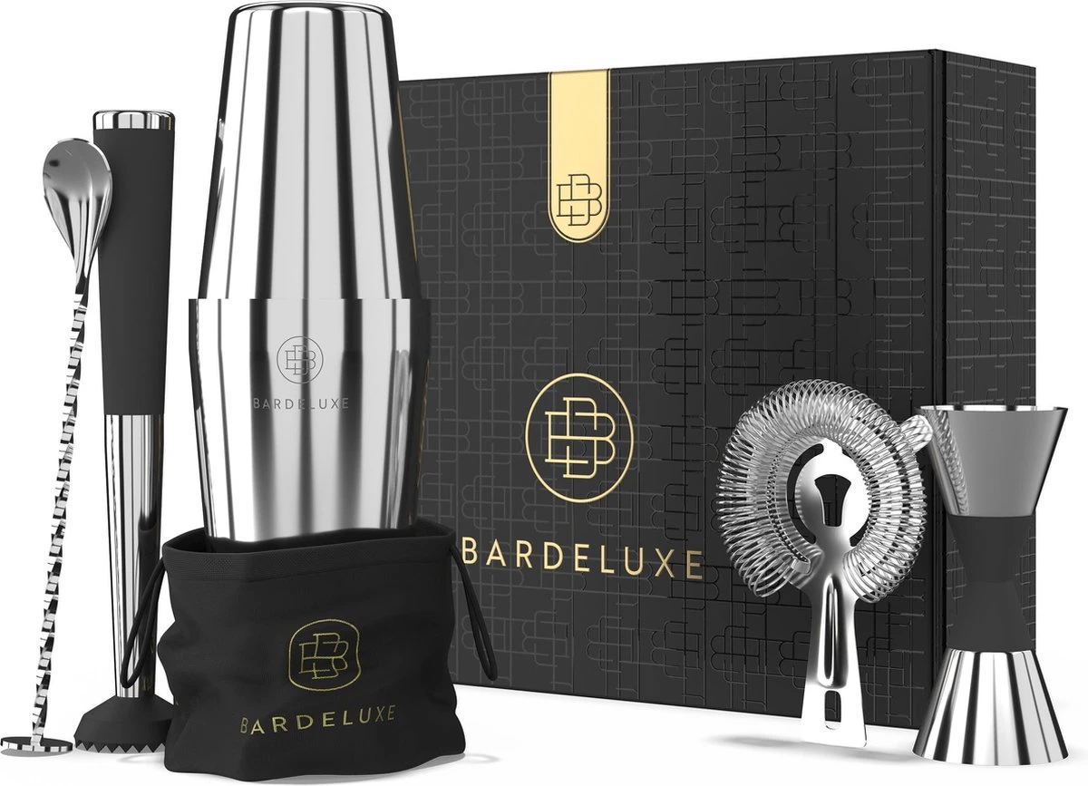 BarDeluxe® Bosten Shaker Cocktail Set – 5-Delig – Boston Shaker – Cocktail Set – Cocktail Stamper – Cocktail Zeef – Bar Lepel – Inclusief Receptenboek + Bewaarhoes – Cocktail Set Zilver