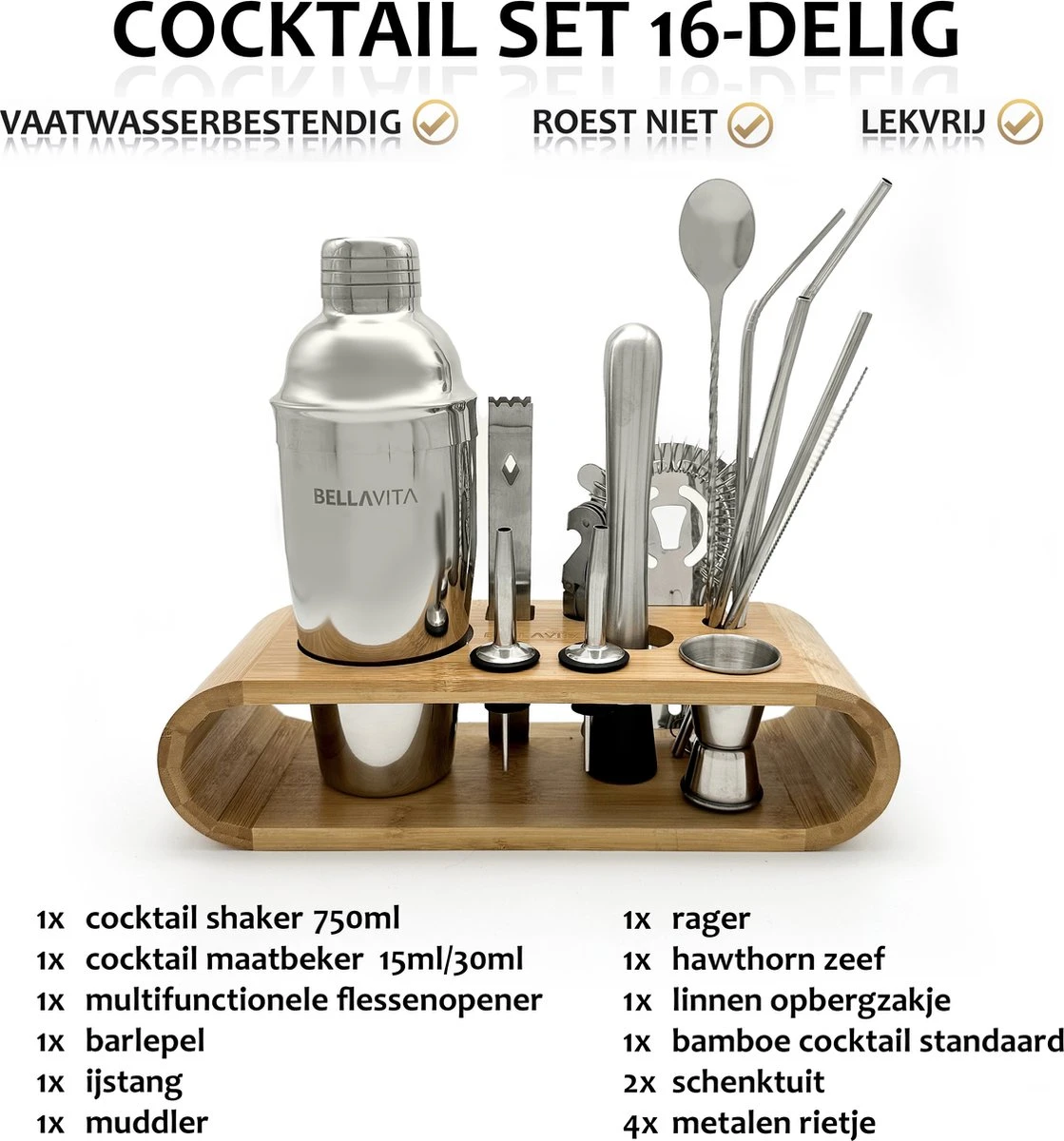 Zou jij graag zelf cocktails willen maken? Dan heeft Bellavita de oplossing voor jou!Met onze 16-delige set halen wij de bartender in jou naar boven.Verras je vrienden en familie met de lekkerste cocktails en geef ze een fantastische avond!