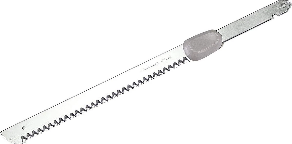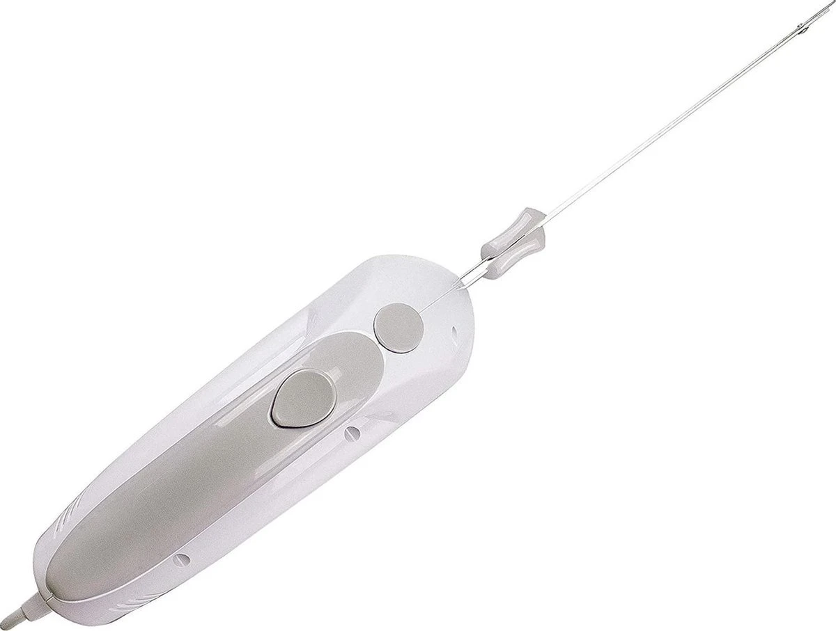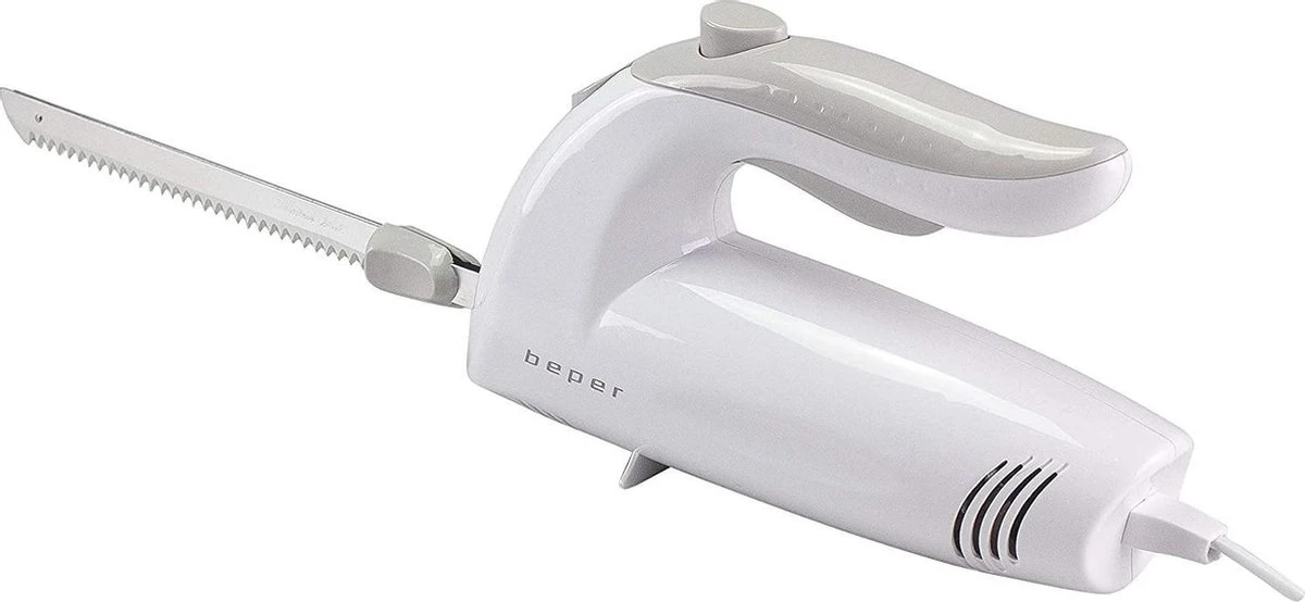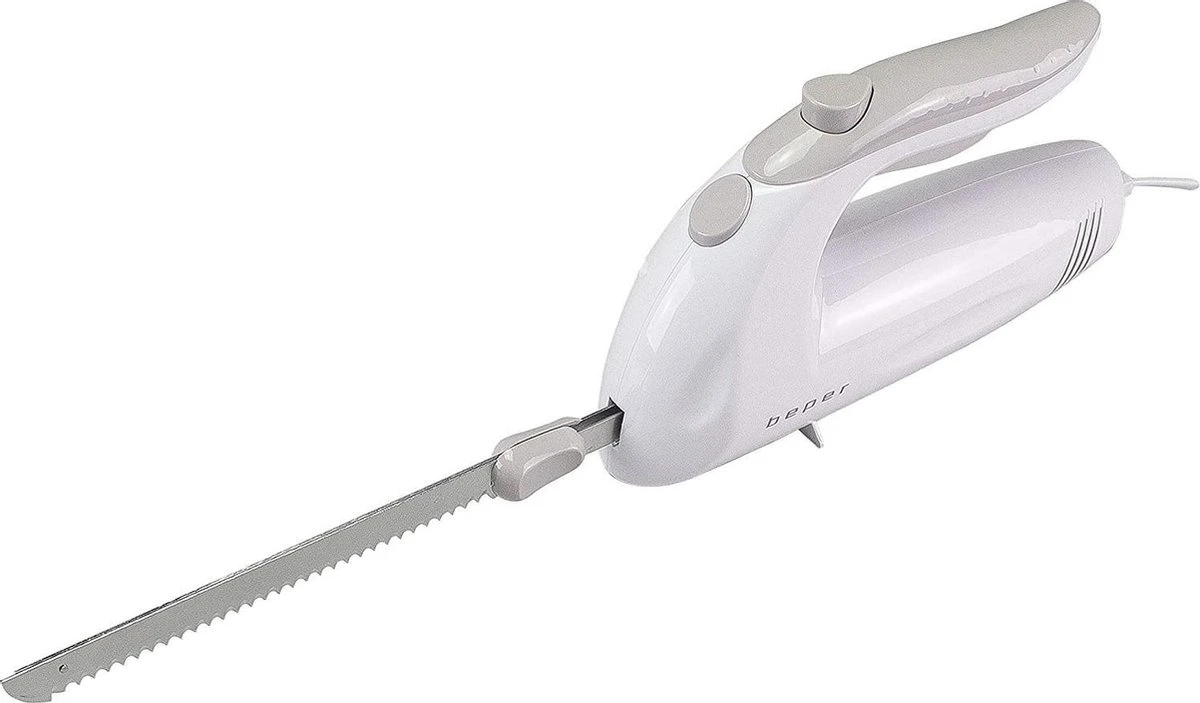 - Elektrisch mes met ABS body en zelfslijpende roestvrijstalen messen van 17 cm. Voorzien van een knop om de messen uit te werpen en een dubbel veiligheidssysteem. Ergonomische handgreep voor gemakkelijke grip.