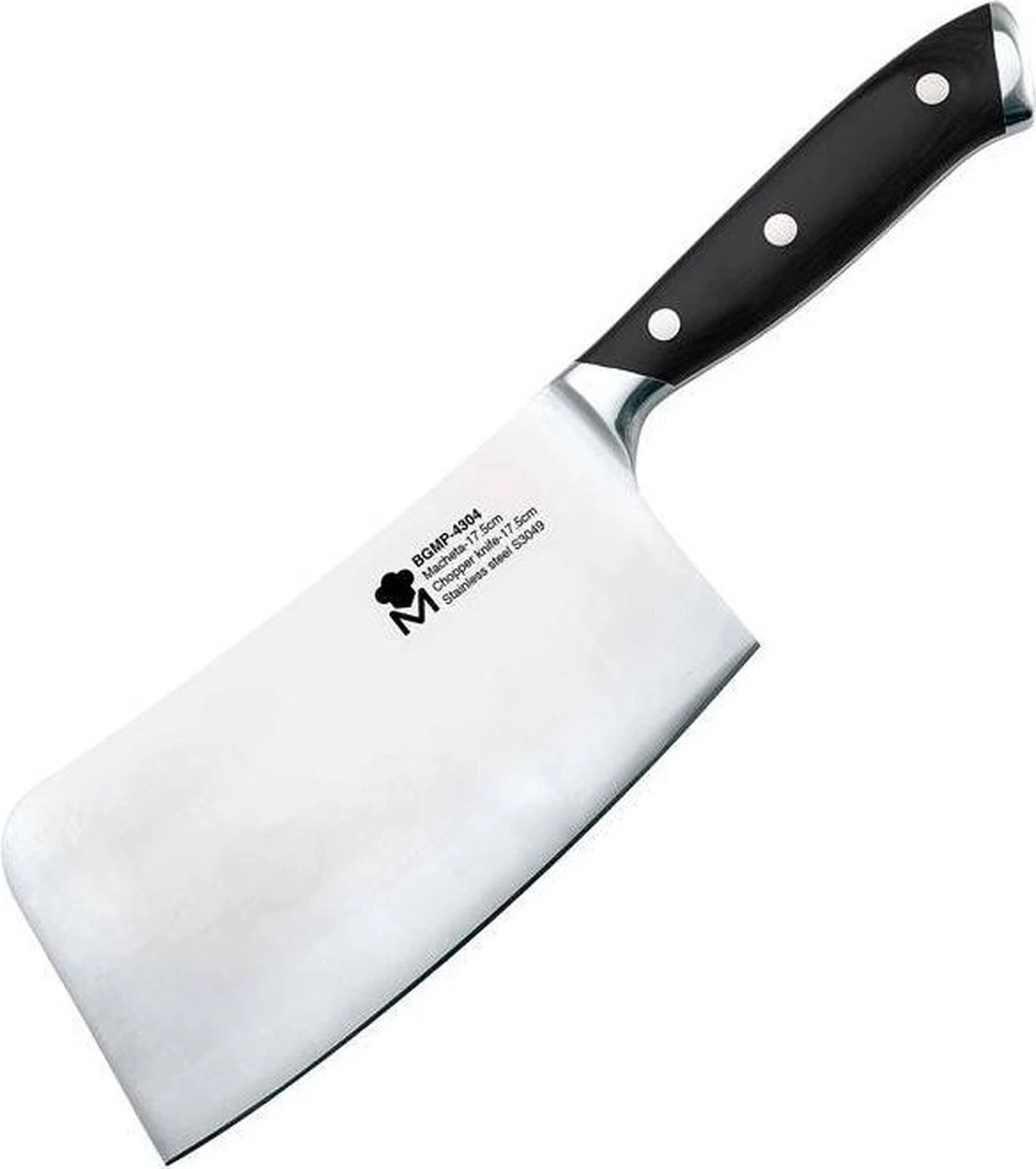 Bergner Masterpro RVS Hakbijl 17.5cm Een keukenmes uit de serie “Masterpro” van Bergner Met deze hakbijl / hakmes kun je vlees, groenten, kruiden en fruit hakken De vlakke zijde kun je gebruiken om vlees, kip of gevogelte te pletten Het dikkere lemmet is handig om bv. botten door te hakken of om spareribs te verdelen Het heft is van hoogwaardig kunststof en met 3 klinknagels bevestigd aan het messenstaal het heft is ergonomisch gevormd en ligt daardoor prettig in de hand Materiaal: S3049 RVS Lengte lemmet: 17.5 cm Totale lengte: 30 cm Type mes: Chopper, hakbijl, hakmes Typenummer: BGMP-4304
