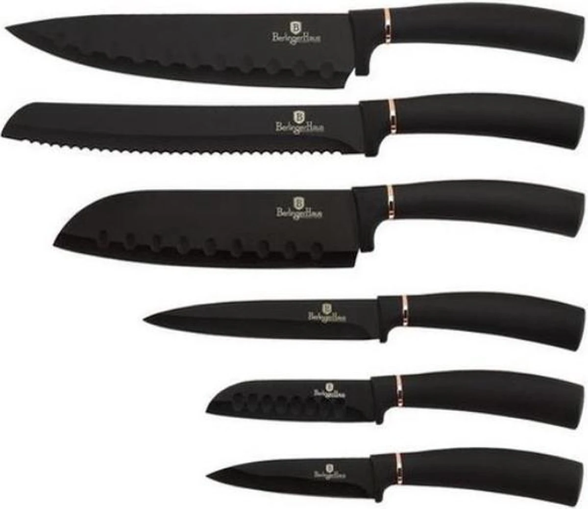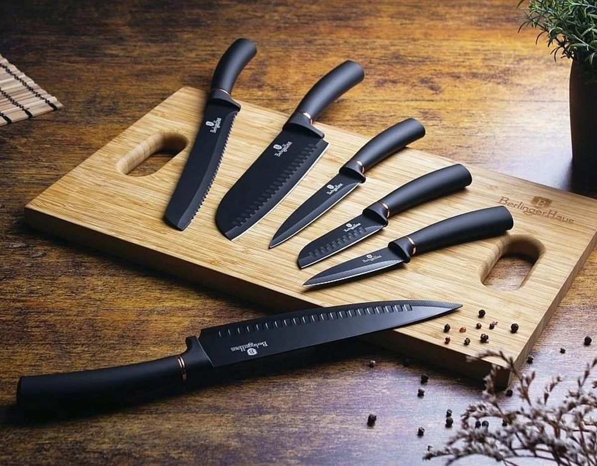 | Aanvullende functies | Product-details<br />Berlinger Haus-messenset: 6-delig<br />Materiaal: roestvrij staal<br />Koksmes: 20 cm<br />Broodmes: 20 cm<br />Santokumes: 17,5 cm<br />Gebruiksmes: 12,5 cm<br />Klein mes: 9 cm<br />Santokumes: 9 cm<br />Kleur: zwart/roségoud |