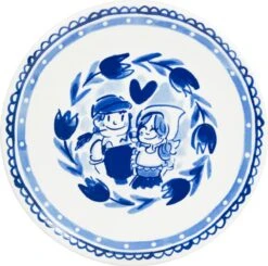 Ontbijtbord in de collectie Delfts Blond. Gekenmerkt door blauwe randen en midden op het bord illustraties van een stel en tulpen. Het ontbijtbord combineer je prima met de andere artikelen uit de Delfst Blondcollectie.