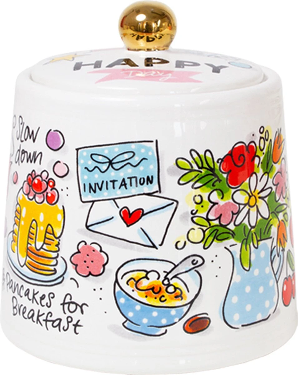 This make me happy! Deze vrolijke suikerpot, maakt jouw tafel nog gezelliger! De opvallende en kleurrijke illustraties zijn in het thema Happy ontworpen. Dit suikerpotje heeft allemaal happy illustraties en teksten en is afgemaakt met een gouden dop. De suikerpot is leuk te combineren met de andere nieuwe Happy items.
