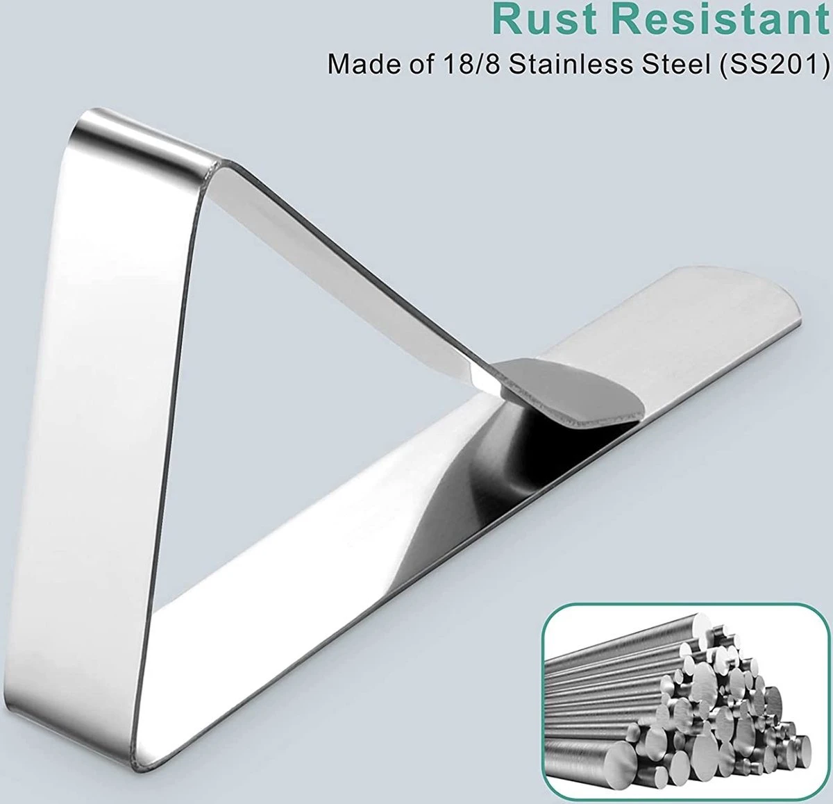 【Hoge kwaliteit】Deze tafelkleed clips zijn gemaakt van 18/8 roestvrij staal, duurzaam en roestbestendig. De clips hebben een gladde en niet-knelbare rand met een goede elasticiteit, en maken het tafelkleed stevig vast aan de tafel.