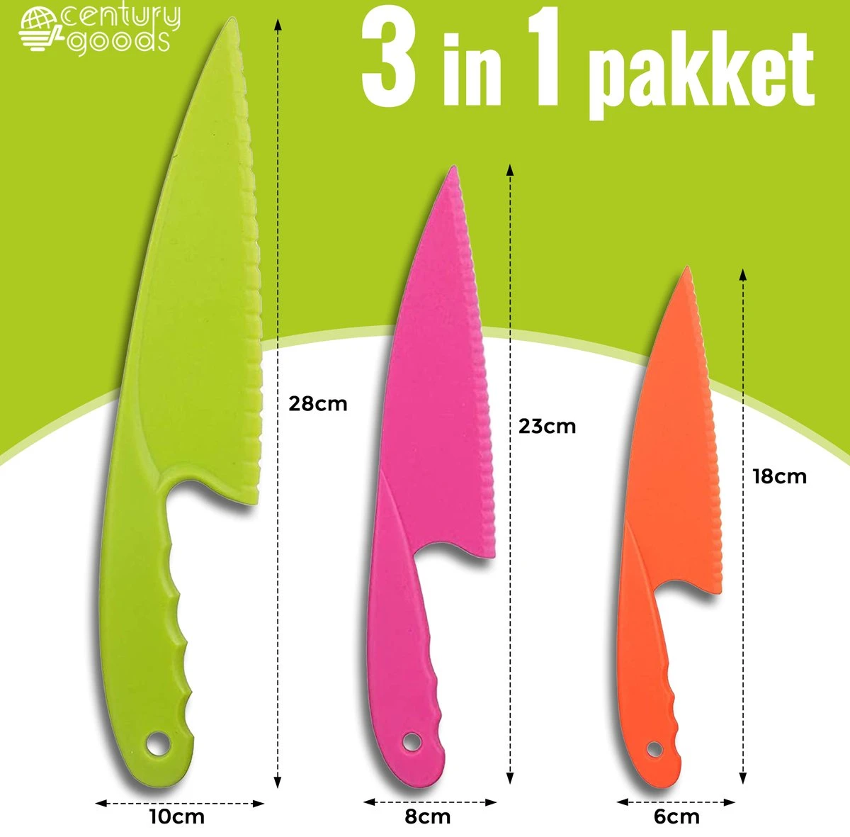 Deze kindermessen van Century Goods zijn speciaal gemaakt voor kinderen die willen helpen in de keuken. Je kan er namelijk goed fruit en groente mee snijden zonder dat je kind het risico loopt in de vingers te snijden. Dit kan dankzij de unieke vormgeving van de messen met afgeronde kartels. Daarnaast liggen de speciaal gevormde handgrepen messen goed in kinderhanden.