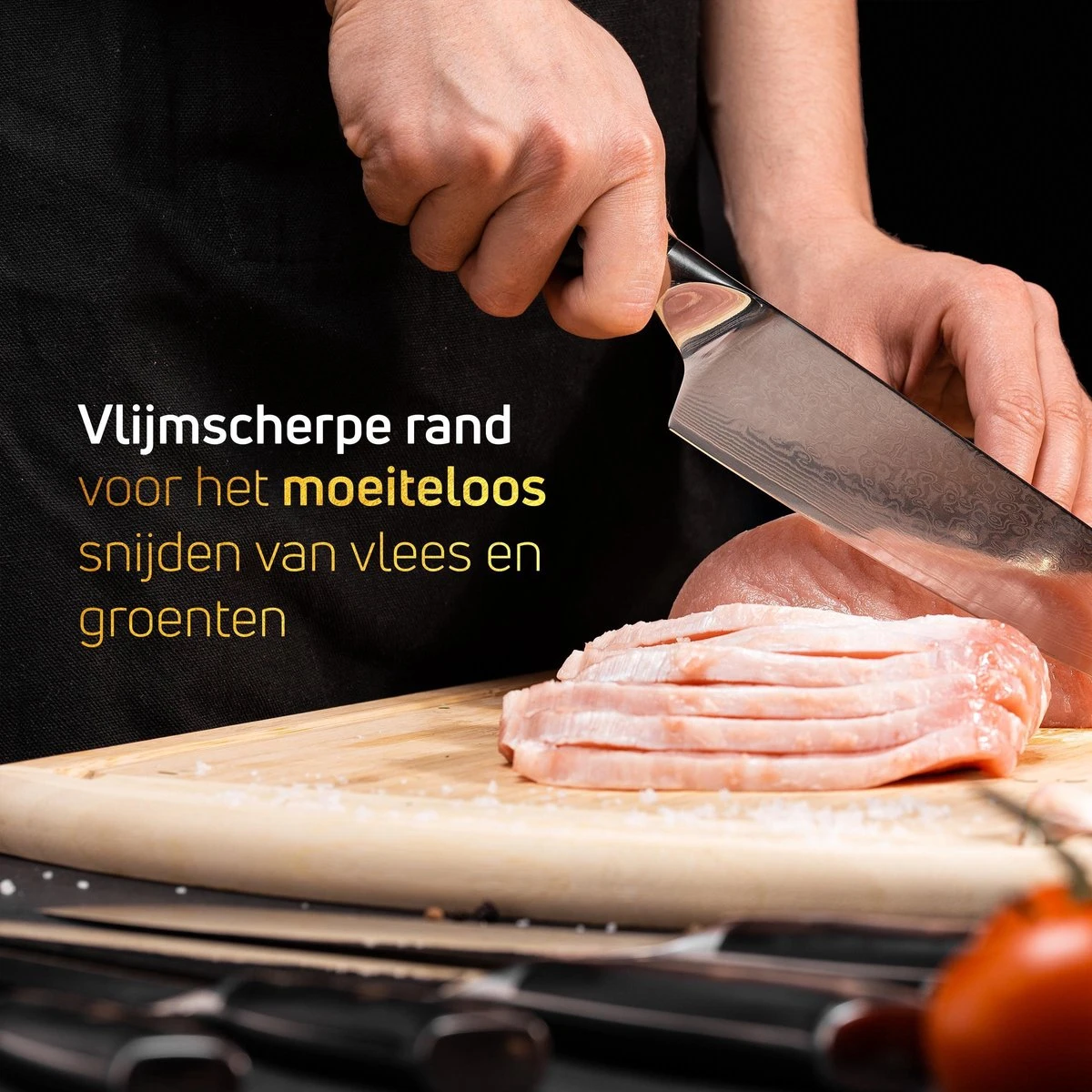 Oersterk-materiaal: Gemaakt van sterk geïmporteerd Japans VG-10 staal als kern, met daar omheen 66 lagen koolstofarme en roestvrijstalen lagen. Het mes heeft een prachtig Tsunami Rose Damascus-patroon.