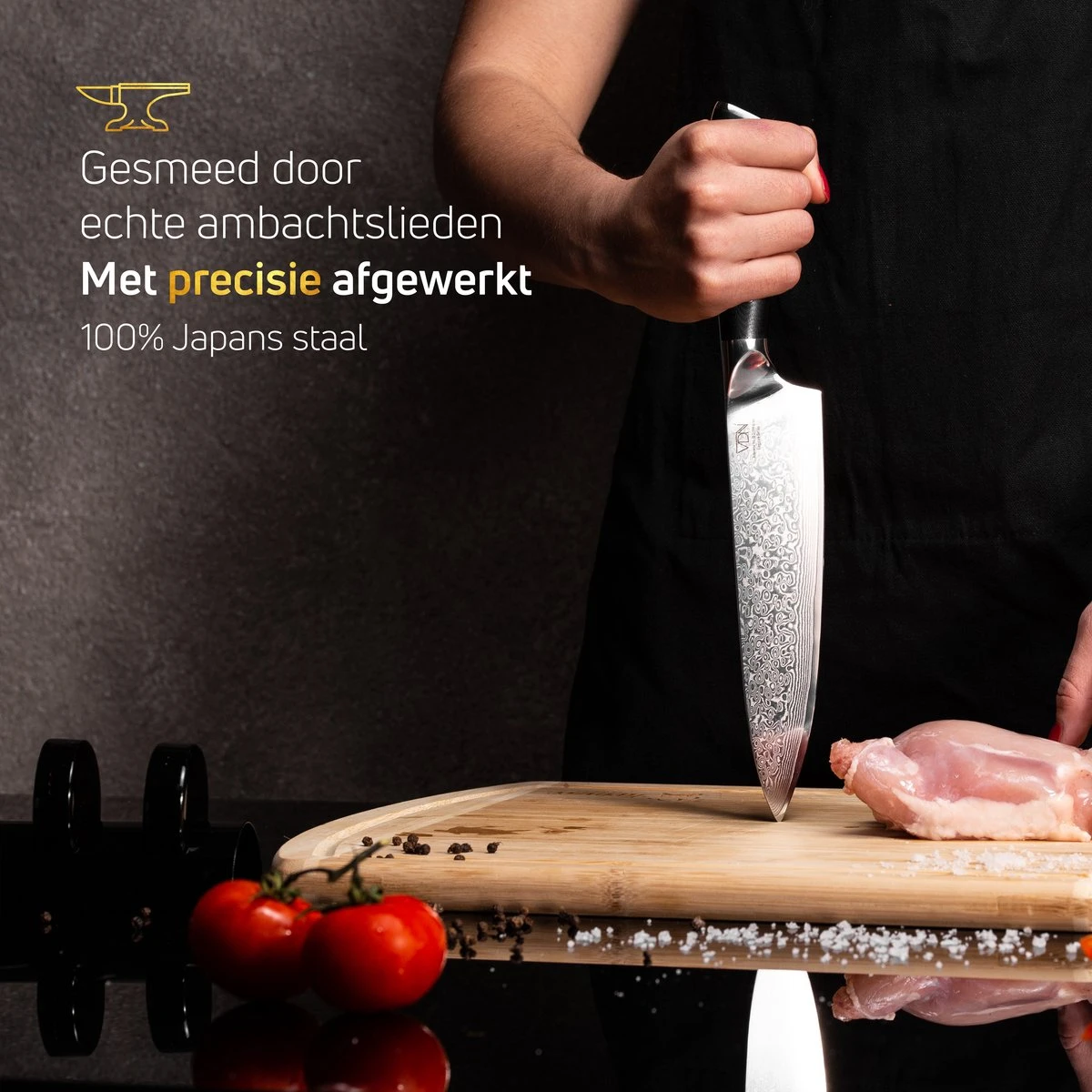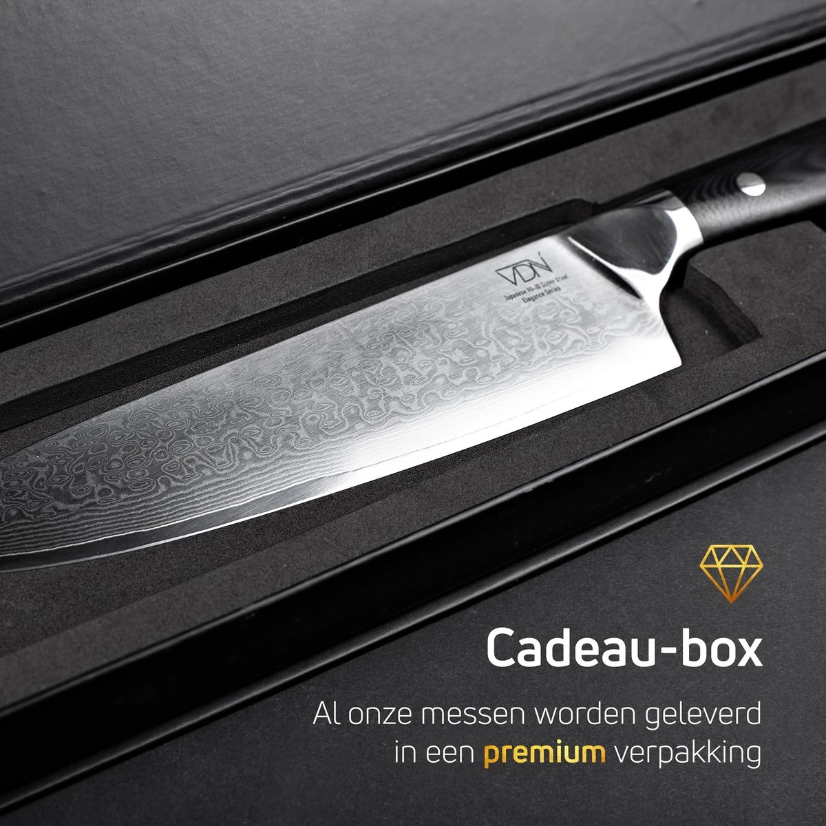 De VDN Elegance-serie bevat alle denkbare keukenmessen. Het lemmet van deze messen heeft een kern van sterk en roestvast VG-10-staal, met een hardheid van 60-62 HRC. Gesmeed door échte ambachtslieden en met precisie afgewerkt. Om de snij-kern heen bevinden zich 66 lagen Japans sierlijk damaststaal. Afgewerkt met een G-10 handvat uit Spanje. Door deze combinatie zijn de keukenmessen niet alleen zeer functioneel, maar ook ware blikvangers in je keuken.