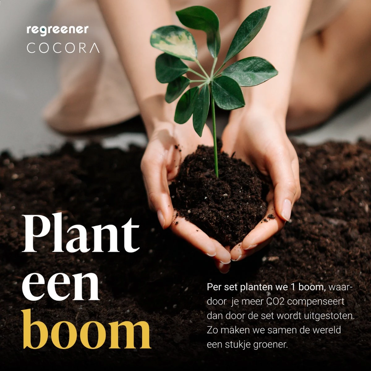 - 1 set = 1 boom – per set planten we één boom, zo ‘overcompenseren’ we onze CO₂ uitstoot en maken we samen de wereld een beetje groener