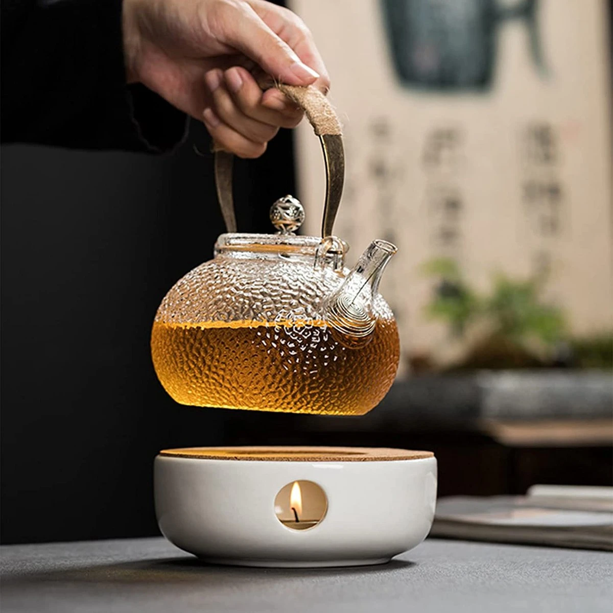 - Hoge kwaliteit: de basis bestaat uit hoogwaardig keramiek en het frame van het theepotblad bestaat uit een kurkhouder, die waterdicht en valbestendig, duurzaam en belastbaar is. Houd de temperatuur van thee en koffie effectief vast. Opmerking: tijdens het verwarmen niet direct met de handen aanraken om brandwonden te voorkomen.