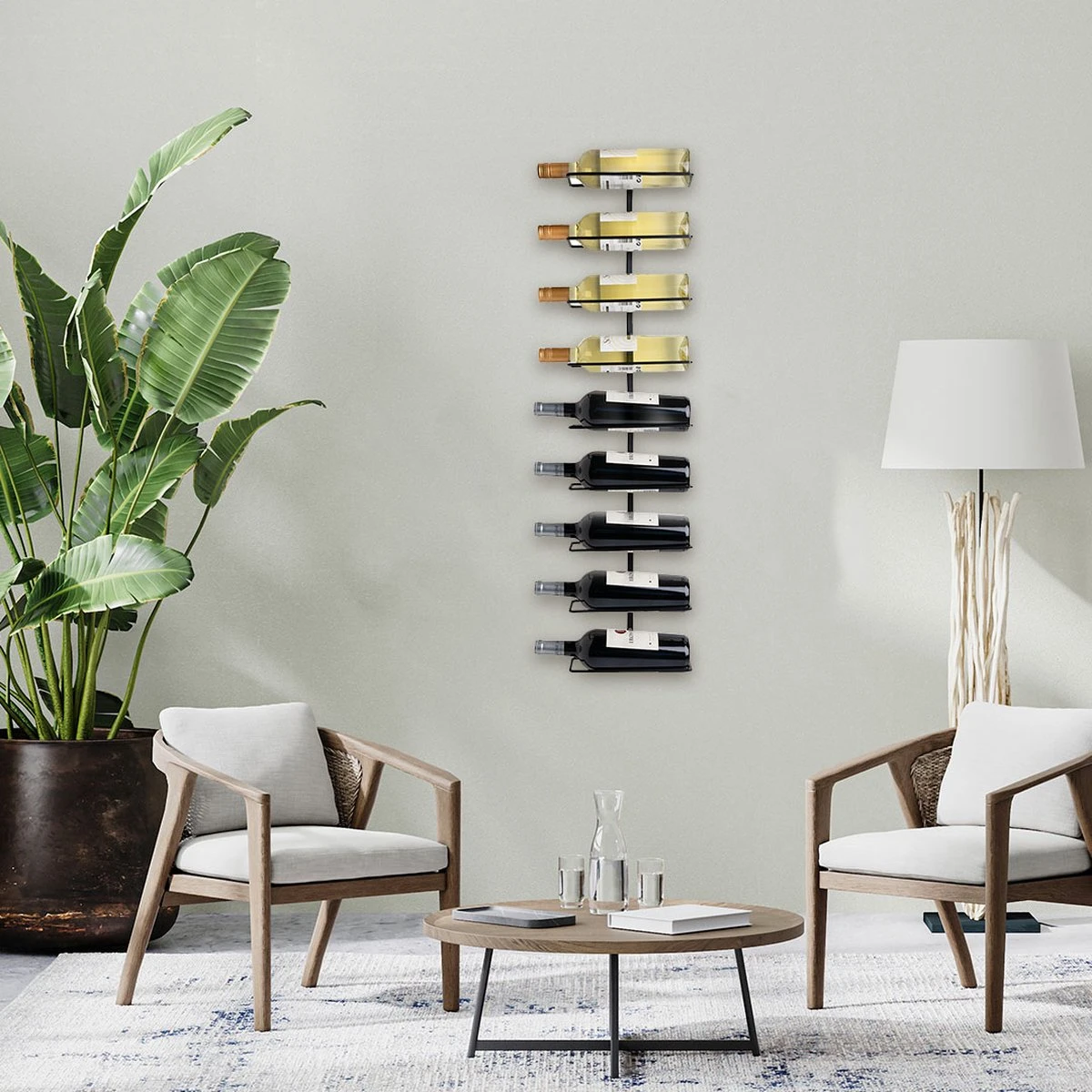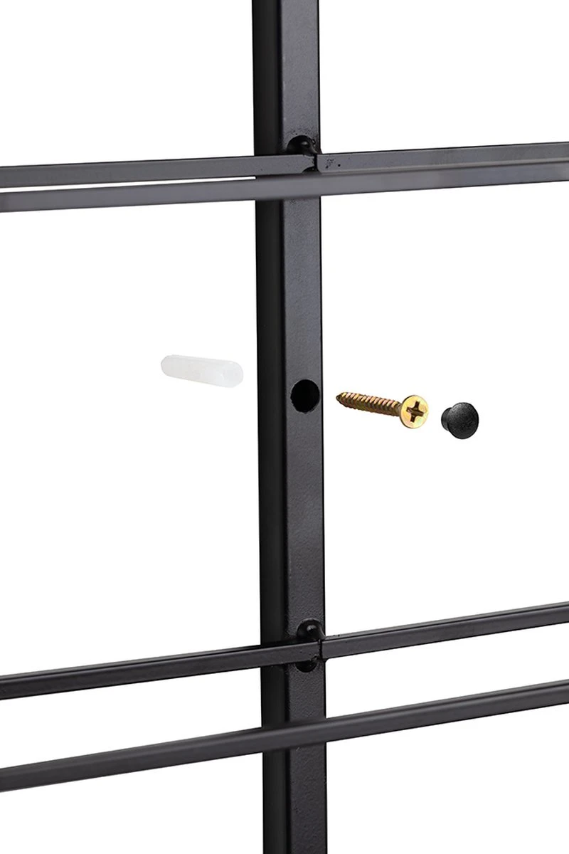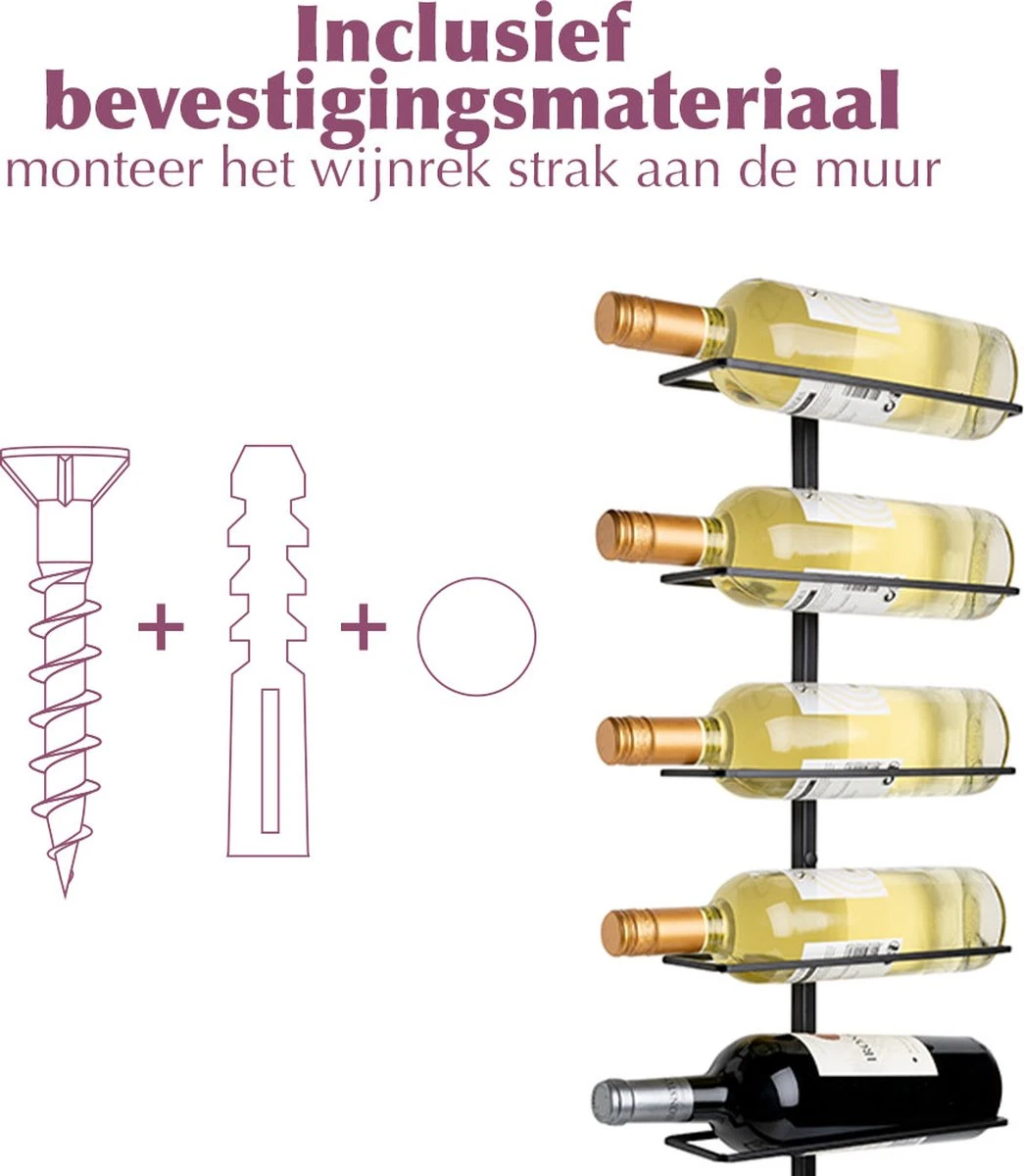 Het wijnrek is gemaakt van zwart metaal waardoor het een luxe uitstraling geeft aan jouw kamer. Door bijgeleverde doppen kun je ook de schroeven wegwerken, dit om de luxe uitstraling te garanderen.