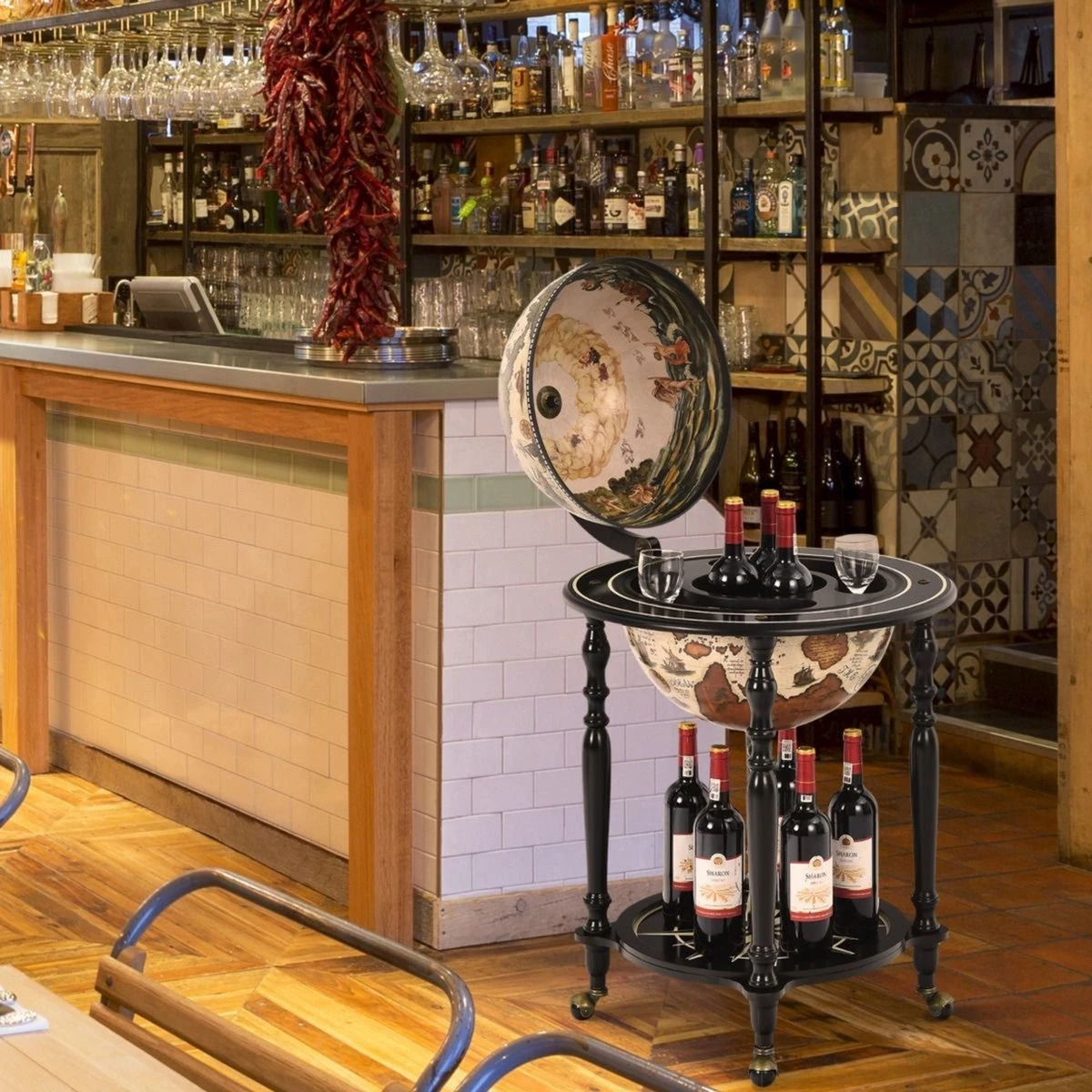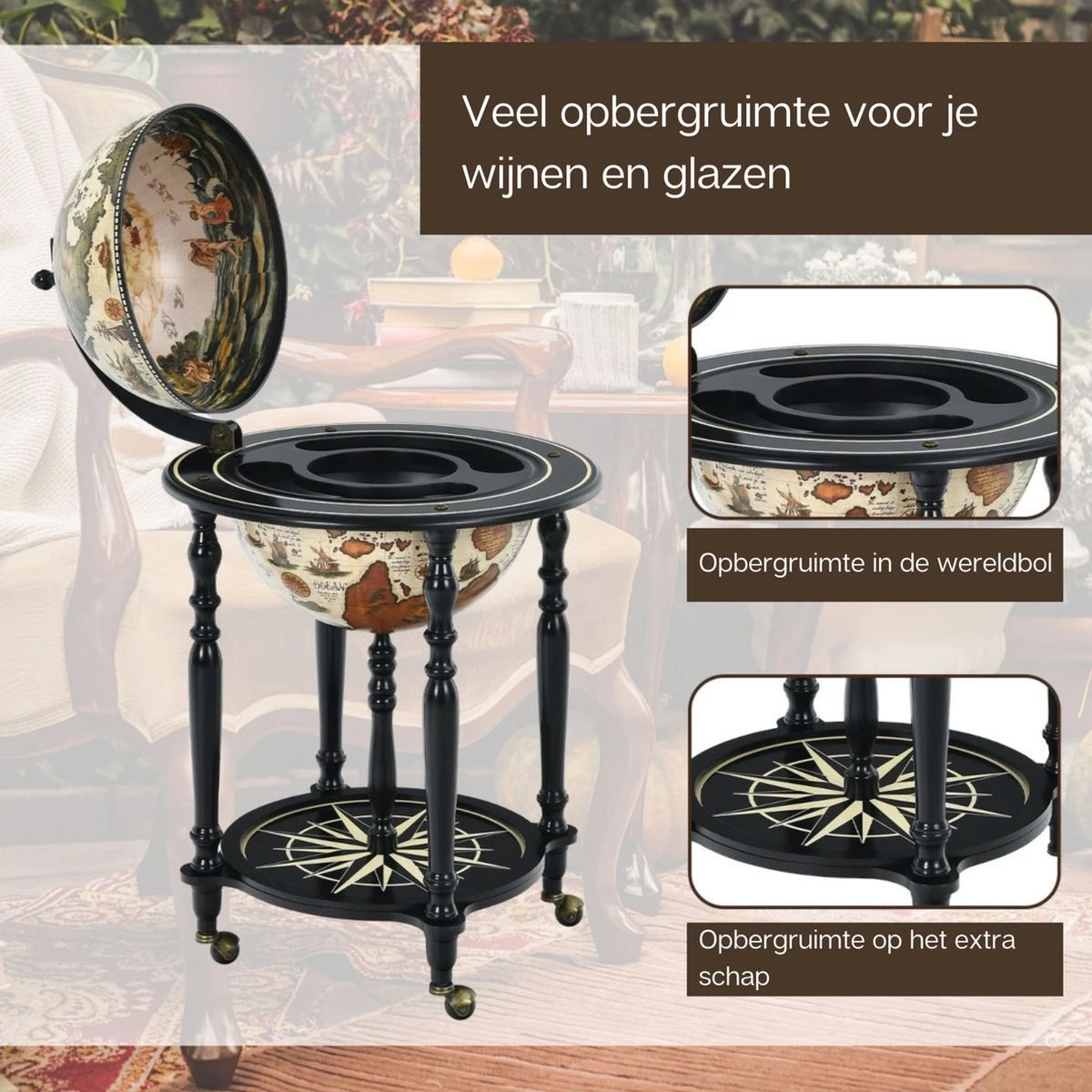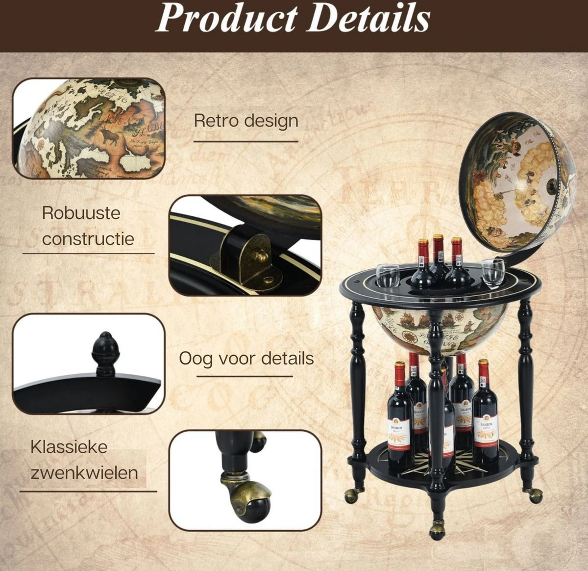 Ben je op zoek naar een mooi wijnrek? Onze unieke en elegante wereldbol bar zal je betoveren met zijn bijzondere stijl. De globebar is gemaakt van MDF van hoge kwaliteit, is robuust en kan vele jaren worden gebruikt. Dankzij de massief houten poten is hij ook zeer stabiel, zodat je je geen zorgen hoeft te maken over de stabiliteit. Binnenin de wereldbol is er voldoende ruimte voor meerdere wijnflessen en glazen van verschillende grootte. Bovendien zorgen de vier soepele zwenkwielen aan voor een gemakkelijke verplaatsing. Dankzij de perfecte afwerking is het oppervlak mooi glad en zorgt voor een uniek gezicht. Aarzel niet langer en vul je huis aan met onze wijnkast!