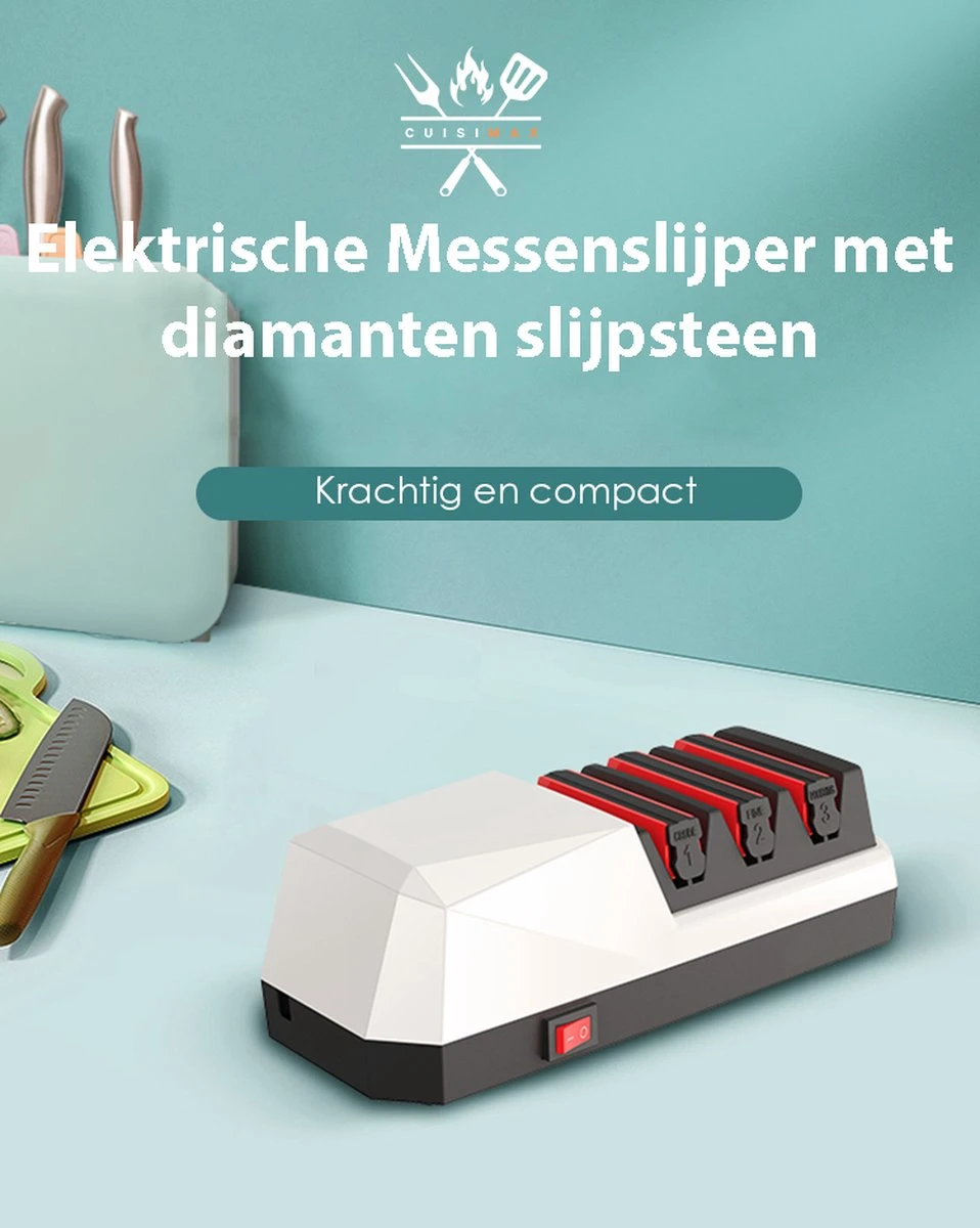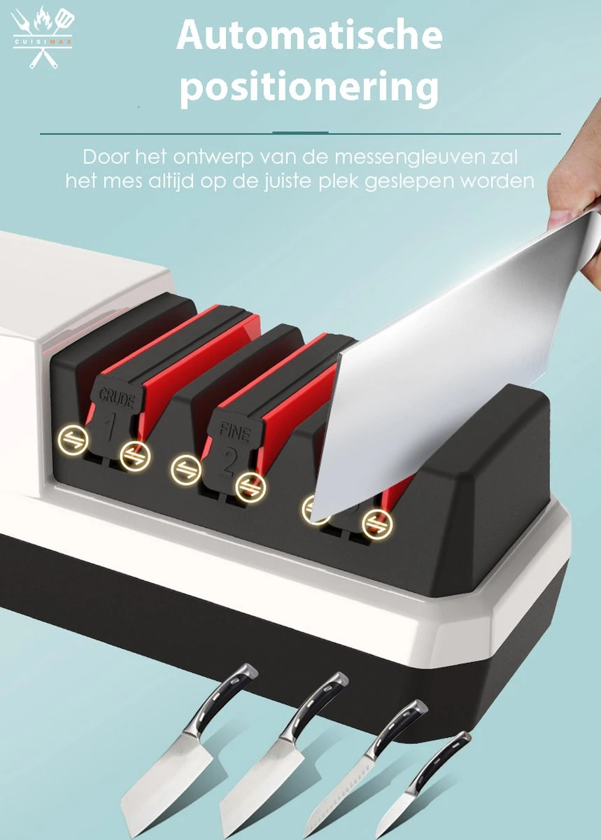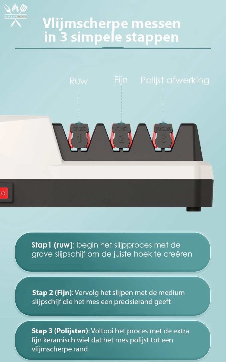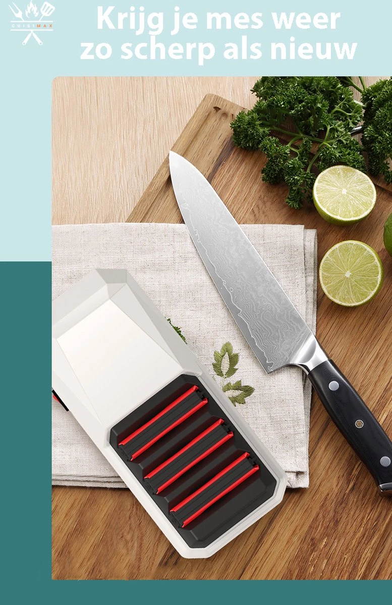 Ergonomisch ontworpen om veilig en efficiënt te zijn om je keuken op de hoogte te brengen. We hebben in onze slijper een driestaps design geïntegreerd, grove wolfraamcarbide stalen sleuf voor (extreem) stompe of beschadigde messen. Fijne keramische sleuf voor honing, fineren, polijsten en naschuren.