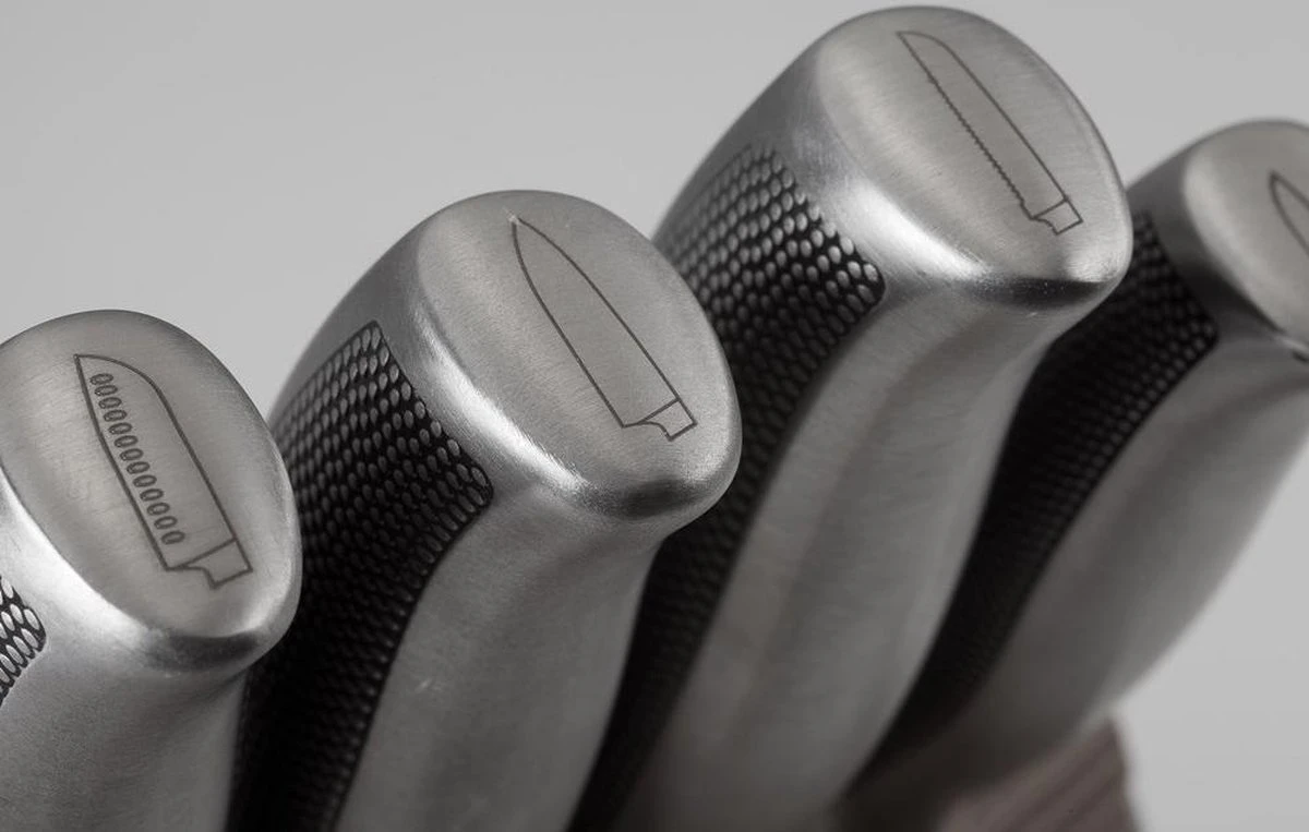 - Op het uiteinde van ieder heft bevindt zich een gegraveerd icoontje waardoor je altijd het juiste mes uit het Riyouri messenblok pakt.