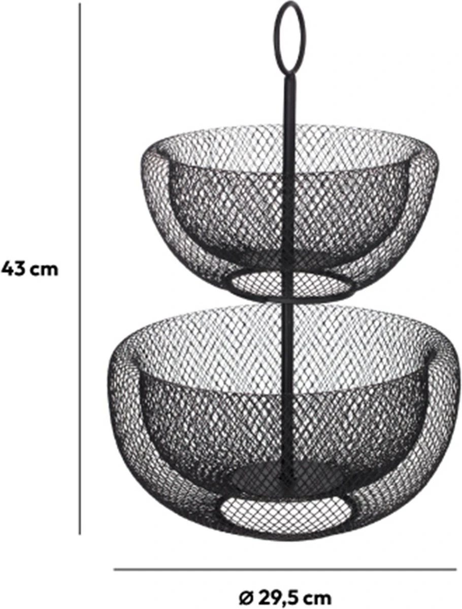 Dubbele etagere fruitschaal/fruitmand rond zwart metaal 30 x 43 cm. De opengewerkte schaal zorgt voor een constante luchtcirculatie waardoor het fruit minder snel overrijp is. Afmeting: ca. D30 x H43 cm. Reinigen: afnemen met een vochtige doek. Fruitschalen/fruitmanden/draadmanden.