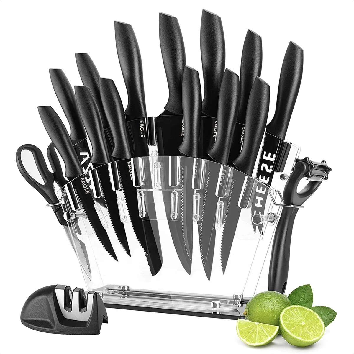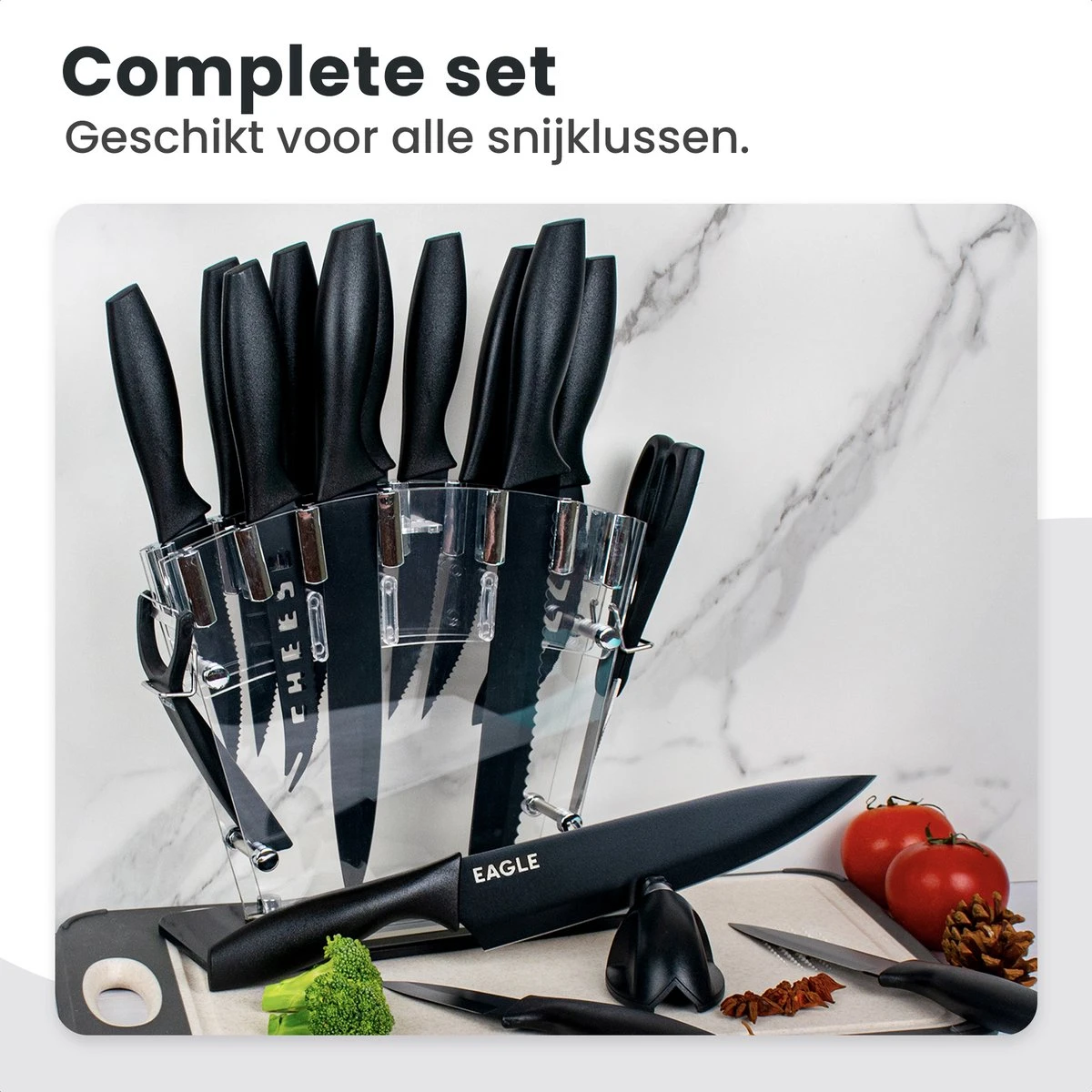 Voor ieder product en gerecht altijd het juiste mes bij de hand met de EAGLE messenset. Deze set beschikt over 13 messen van groot tot klein, een handige messenslijper, keukenschaar en dunschiller. De messen zijn krasvrij, roestvast en beschikken over een anti-kleeflaag. Zo kun je jaren mee met de complete en kwalitatieve messenset van EAGLE.