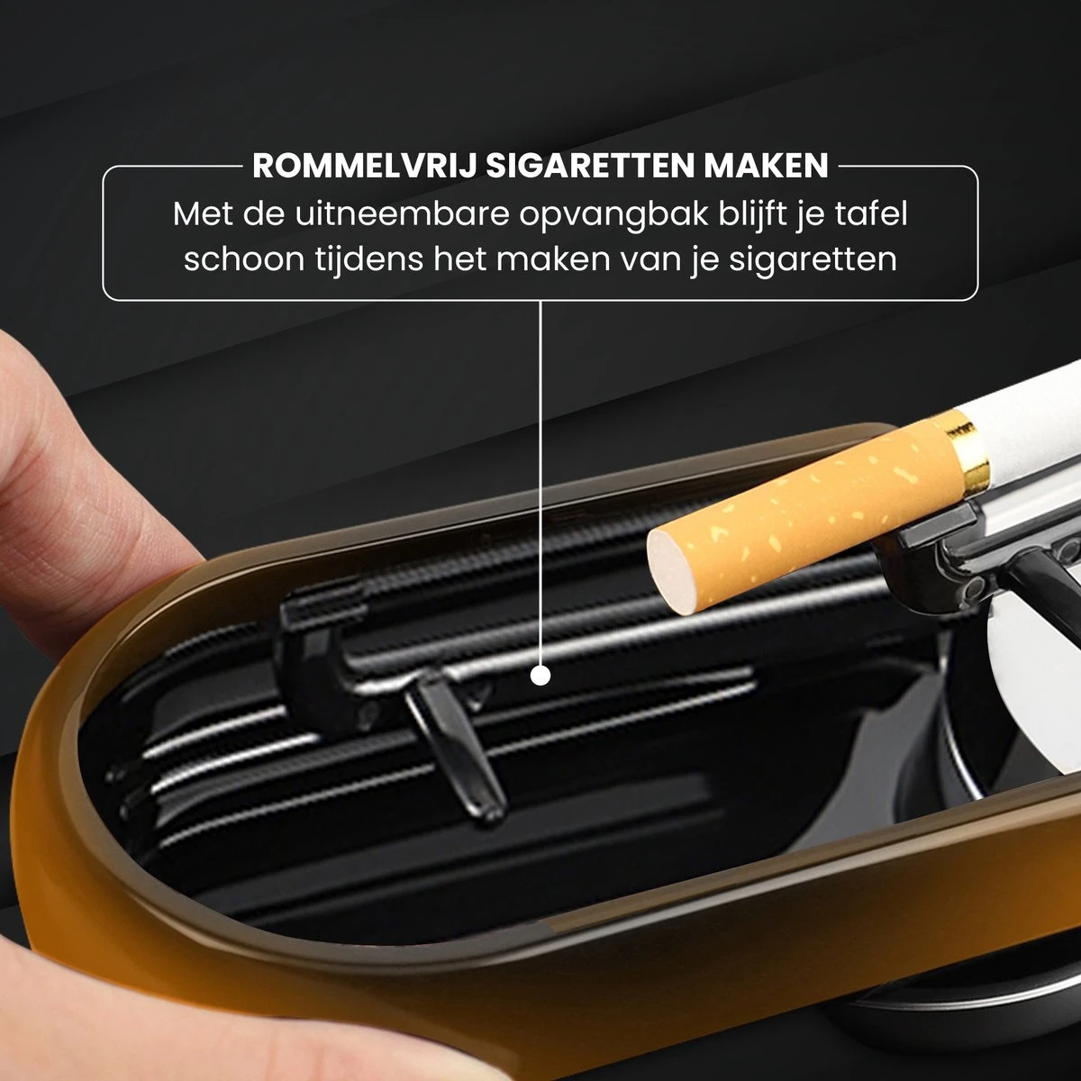Door deze machine heeft u geen last meer van het gepiel en rotzooi van het handmatig draaien. Tevens zit er een opvangbakje bij waardoor verspilde tabak weer makkelijk gebruikt kan worden en het apparaat niet knoeit.