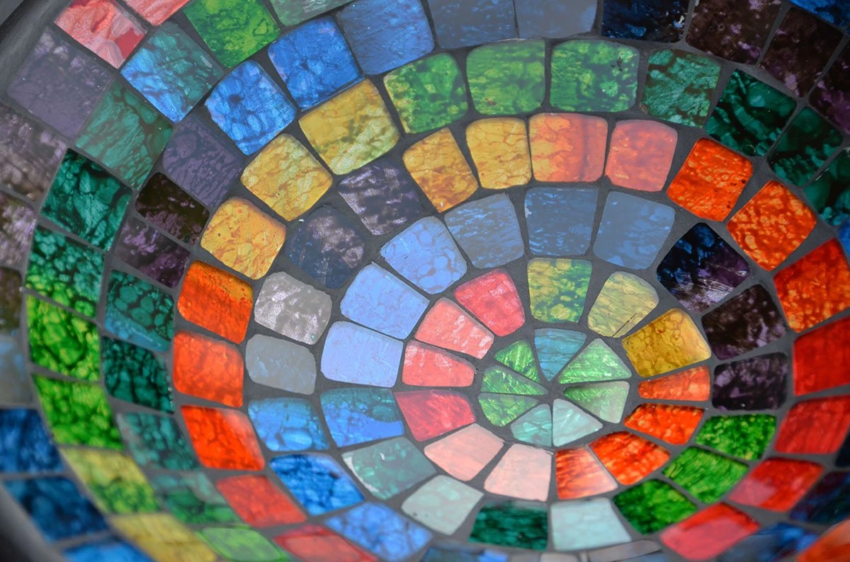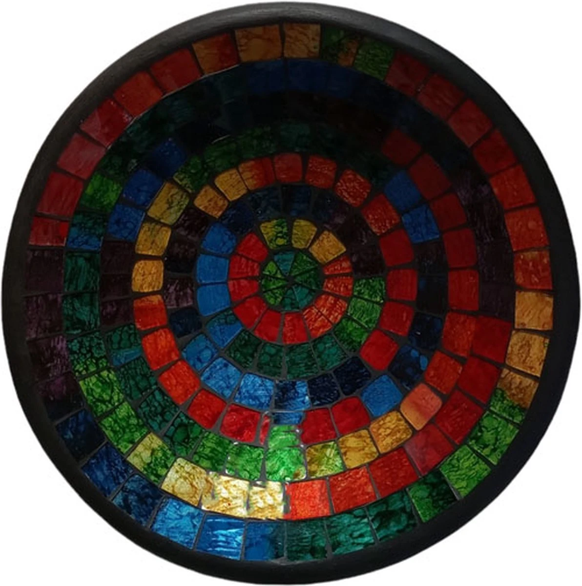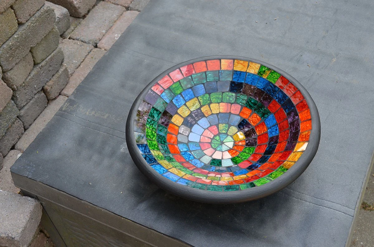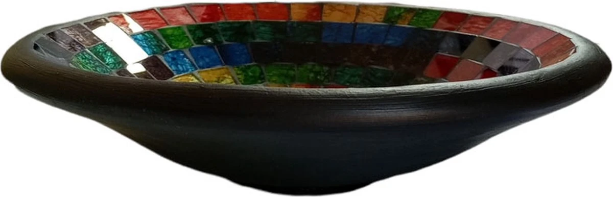 Luxe fruitschaal van aardewerk en glasmozaiek. Kleurrijk!