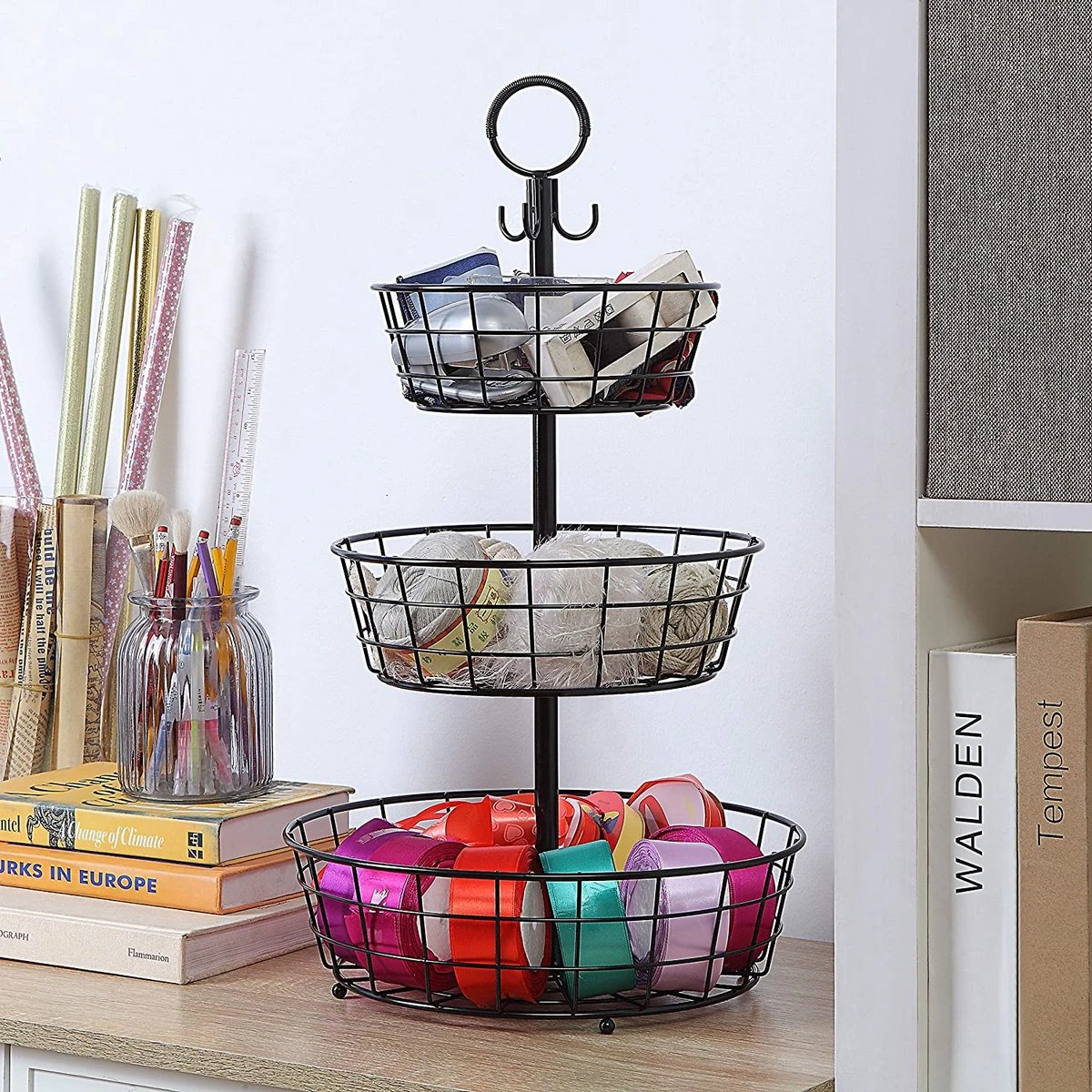 De etagère is gemaakt van een stevige metalen frame en heeft drie manden en een haak voor bananen of druiven. De manden zijn ruim, hebben aan alle zijden een opengewerkt design en er past veel in. Het is daarnaast eenvoudig te monteren. Schroef eenvoudig de drie manden en drie stangen aan elkaar met de meegeleverde inbussleutel. De degelijke constructie en het ontwerp zorgt voor een sterke stabiele etagère van hoogwaardige kwaliteit.