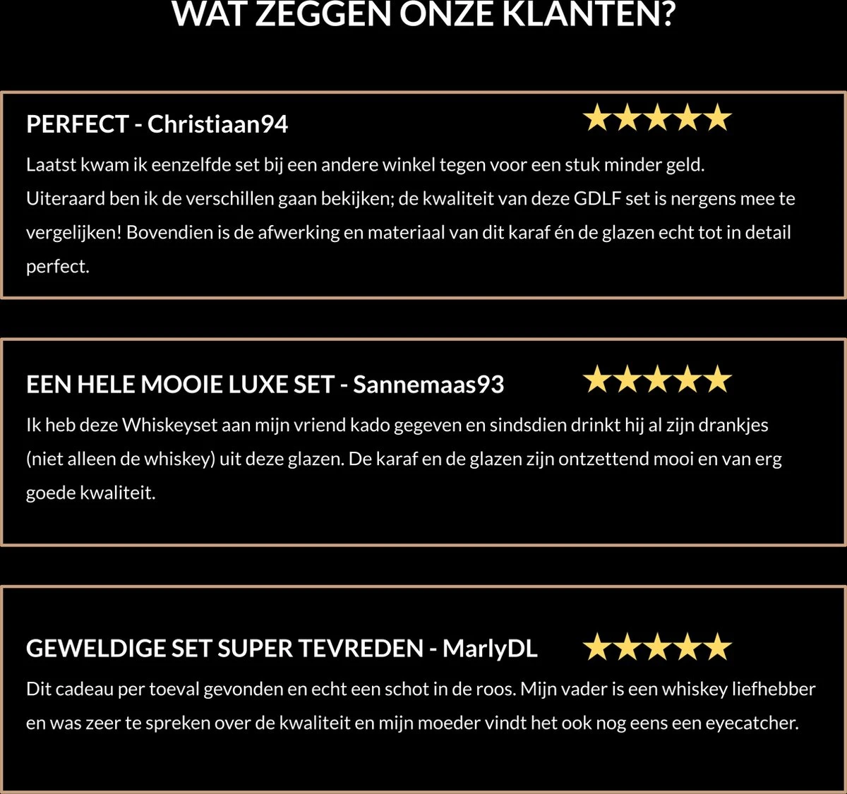 Wij besteden veel zorg aan de kwaliteit en duurzaamheid van onze whiskey sets. Wanneer je niet volledig tevreden bent met dit product, kan je ze gratis retourneren en krijg je je geld gewoon weer terug. Daarnaast verzenden we ze gratis en heb je 30 dagen bedenktijd. Zo loop jij geen enkel risico.