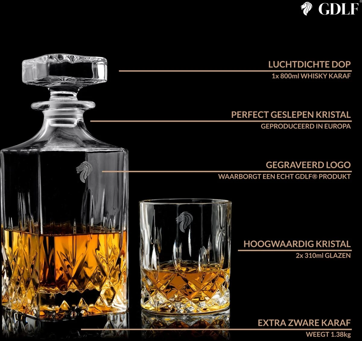 Bij GDLF® kiezen we voor kwaliteit boven kwantiteit. Je zult er trots op zijn deze prachtige vintage whiskey karaf en glazen te bezitten en te laten zien! GDLF® is voor degenen die het goede leven leiden, speciaal voor degenen die genieten van tijdloze producten van hoge kwaliteit.