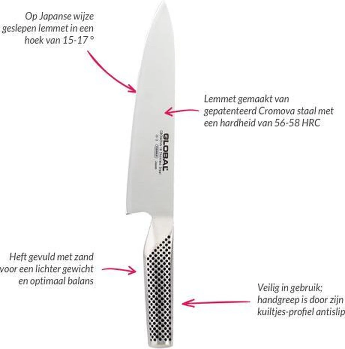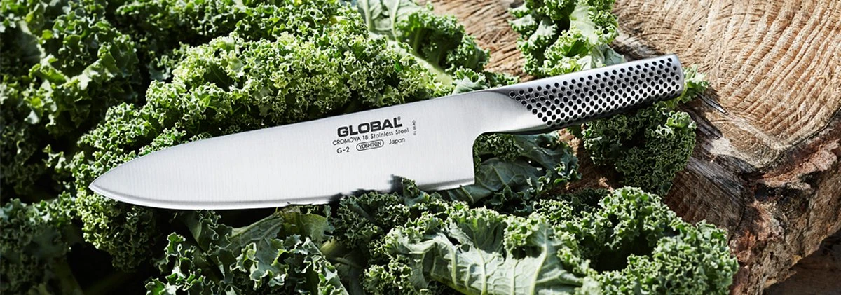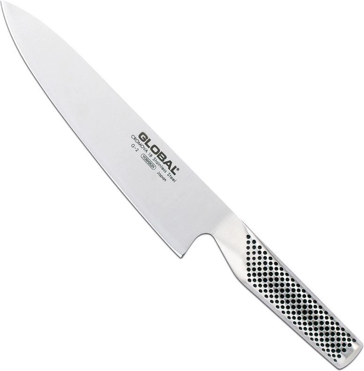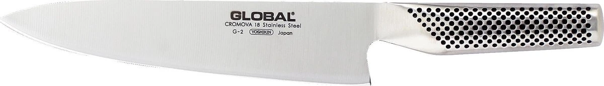 Global Koksmes G2 – 20 cmSnel grote hoeveelheden voedsel snijden? Of groenten hakken? Geen hobby- of professionele kok kan zonder een goed koksmes. Een koksmes behoort tot de basisuitrusting van elke kok. Professionele koks prefereren een koksmes met een lemmet van 26 cm of zelfs nog groter. Hobbykoks kiezen vaak voor een bescheidener afmeting, met een lemmetlengte van 20 cm.Global G-SerieDe Global G-serie is de eerste serie en meest populaire serie van het merk Global en is daarmee ook de meest uitgebreide serie. In deze serie bevinden zich onder andere koksmessen, vleesmessen, vismessen, keukenmessen en de benodigde accessoires om uw keukenuitrusting compleet te maken.De messen van het Japanse merk Global zijn gemaakt van gepatenteerd Cromova staal. Deze staalsoort met een hardheid van 56 – 58 Rockwell garandeert weinig breuk en is zo goed als roestvrij.De Global messen zijn geslepen onder een hoek van 15 – 17°, hierdoor krijgt u bij gebruik een nog fijner snijresultaat. Bij de Europese messen ligt dit tussen de 20-22°. De kleine slijphoek zorgt ervoor dat een Global mes bij het snijden minder weerstand geeft, waardoor het makkelijker door het ingrediënt snijdt. De Global messen liggen goed in de hand, mede door de antislip kuiltjes welke in het heft zijn verwerkt. Het heft is gevuld met zand voor een lichter gewicht en een optimale balans.