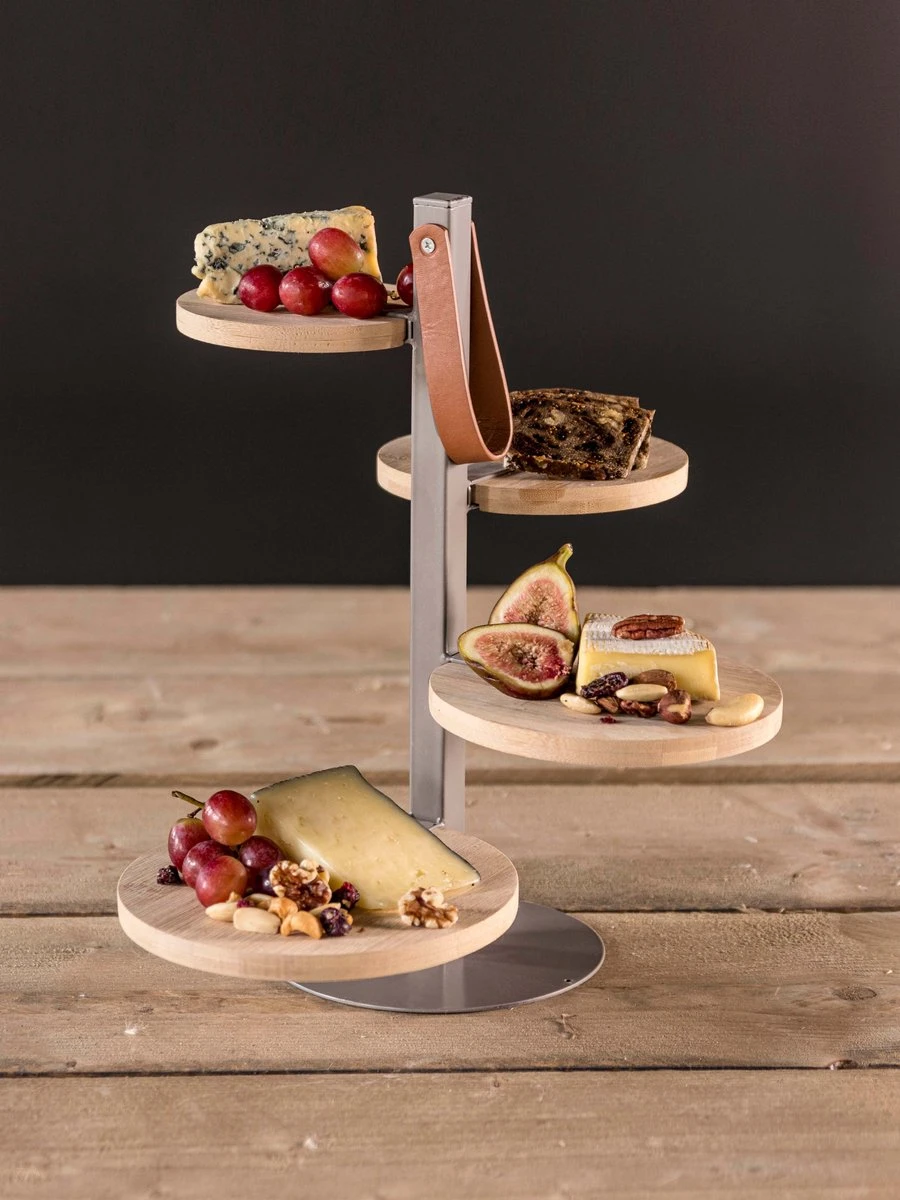 De toren is gemaakt van metaal in een grijze kleur en de plateaus zijn van bamboe, in een mooie naturel kleur. De plateaus hebben een diameter van 16 cm en de toren heeft een totale hoogte van 36 cm. Aan de bovenzijde zit een stevige leren lus waarmee je de etagère eenvoudig kunt verplaatsen.