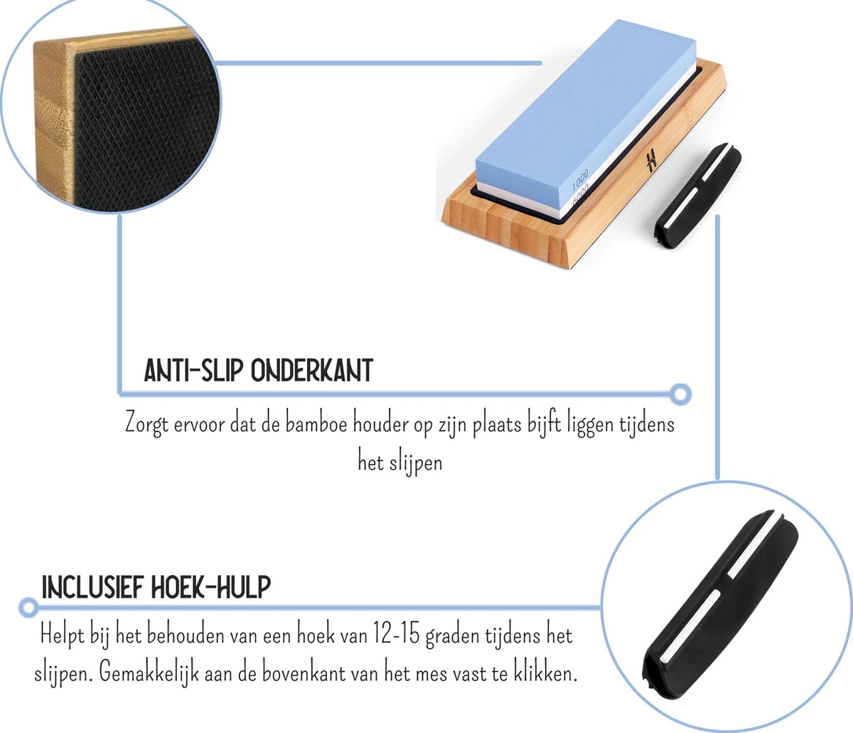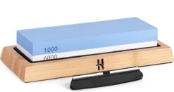 Het gebruik van de wetsteen is eenvoudig, maar bovenal ook veilig. De onderzijde van de hoogwaardige bamboe houder is voorzien van een antislip laag waardoor deze altijd op zijn plaats zal blijven staan. Daarnaast wordt er een hoekbegeleider meegeleverd waarmee je de ideale slijphoek kunt behouden. Na gebruik spoel je de wetsteen onder de kraan af.