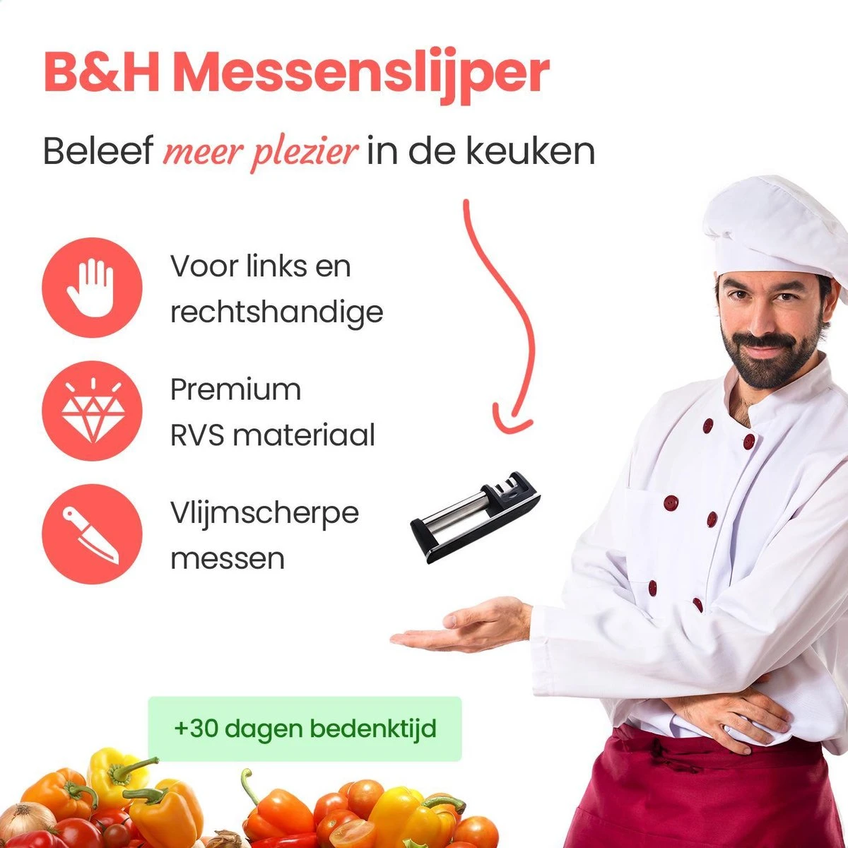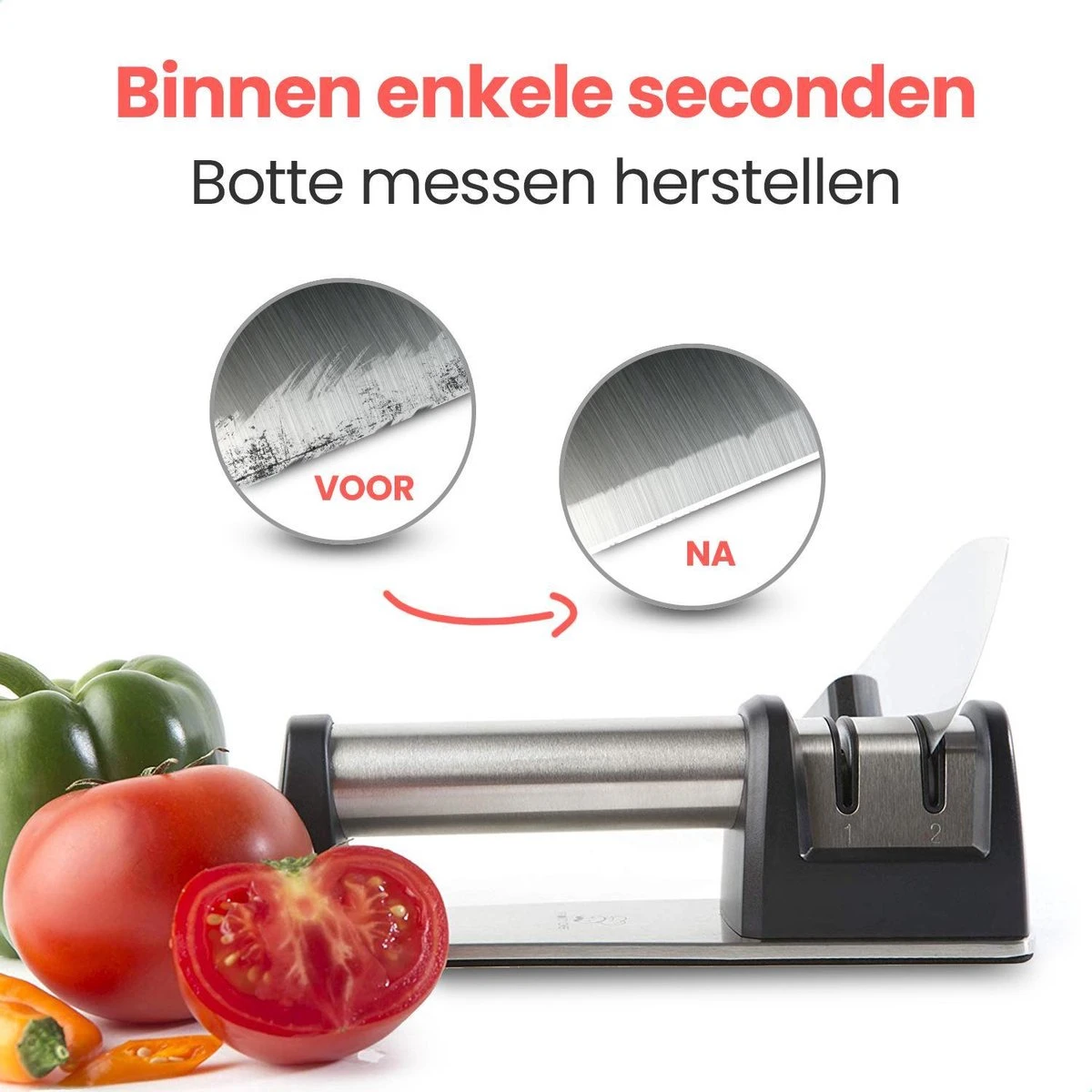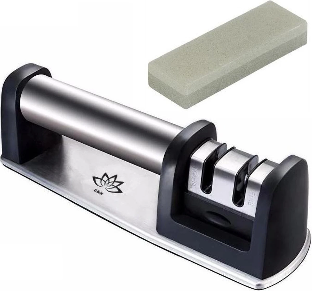 Botte messen, geplette tomaten en frustraties in de keuken, je kookplezier kun je er helemaal door verliezen. Botte messen zijn van nu af aan verleden tijd dankzij de exclusieve messenslijper van B&H. Deze premium slijper bevat twee slijp fasen zodat zelfs je meest roestige en botte messen weer vlijmscherp worden.