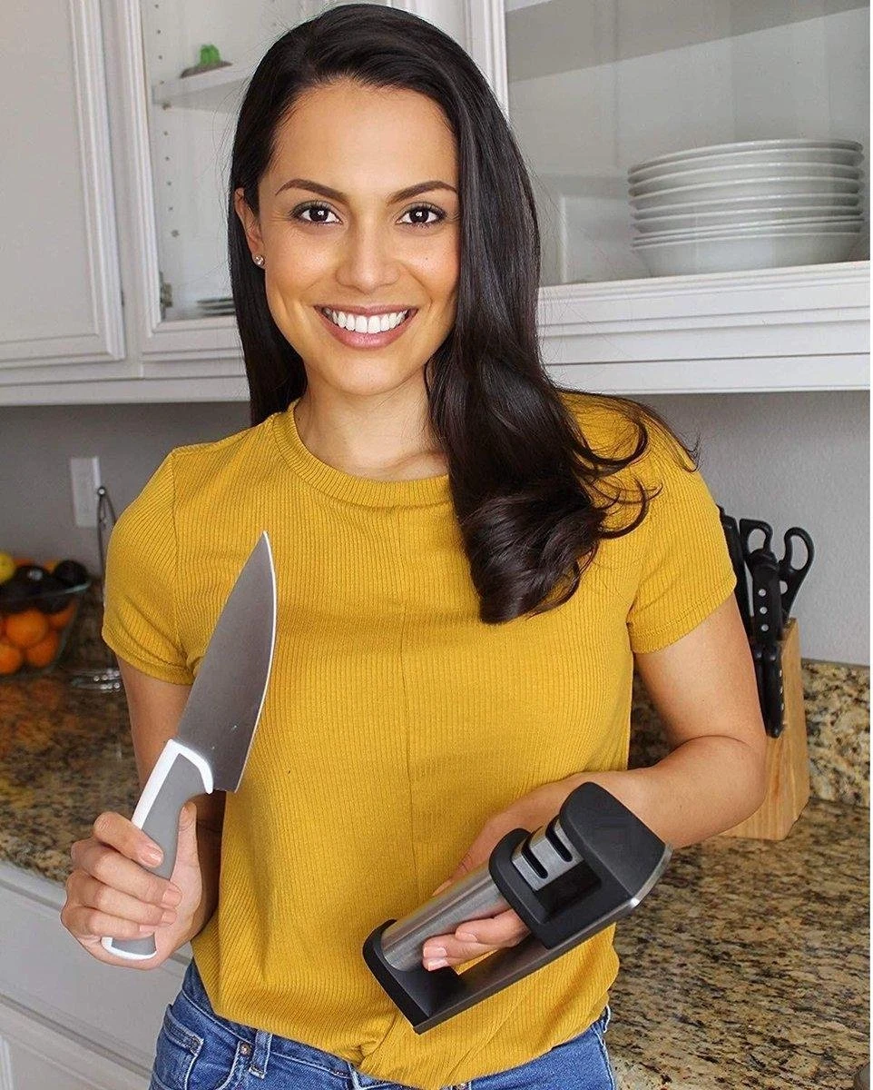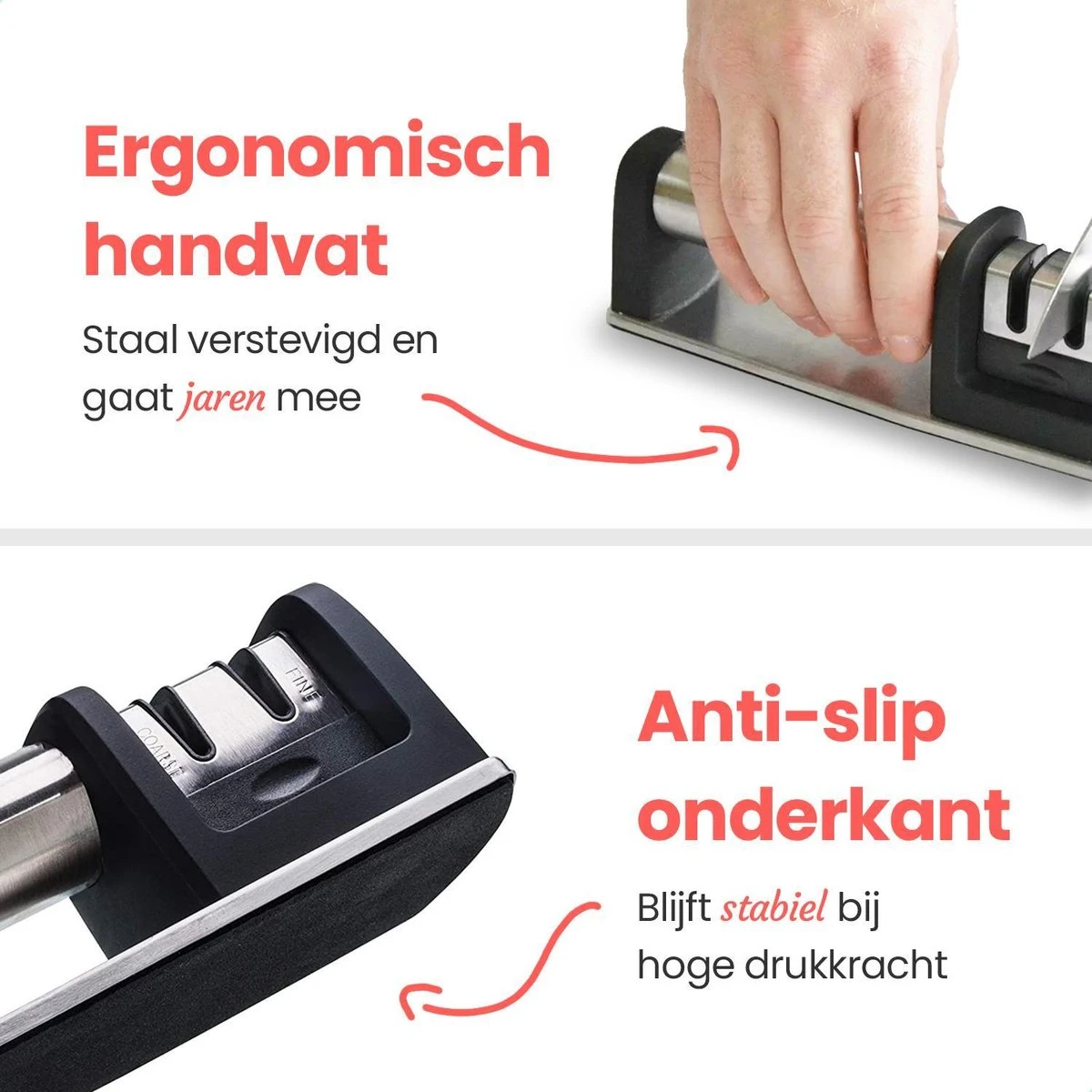 ERGONOMISCH HANDVAT – In tegenstelling tot de meeste messenslijpers bevat deze messenslijper een met staal verstevigd (ergonomisch) handvat waardoor deze klaar is voor jaren intensief gebruik. Je hoeft dus niet bang te zijn na 2 maanden weer een nieuwe te moeten kopen.