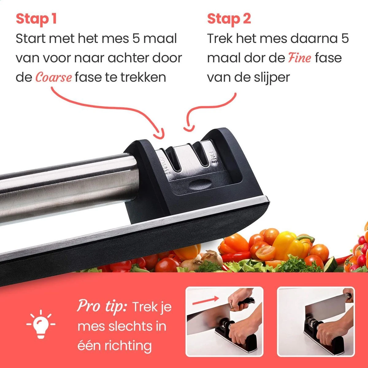 TIP VOOR GEBRUIK – Beweeg het mes niet op en neer door de slijper. Voor optimaal resultaat beweegt u het mes slechts in een richting door de slijper.