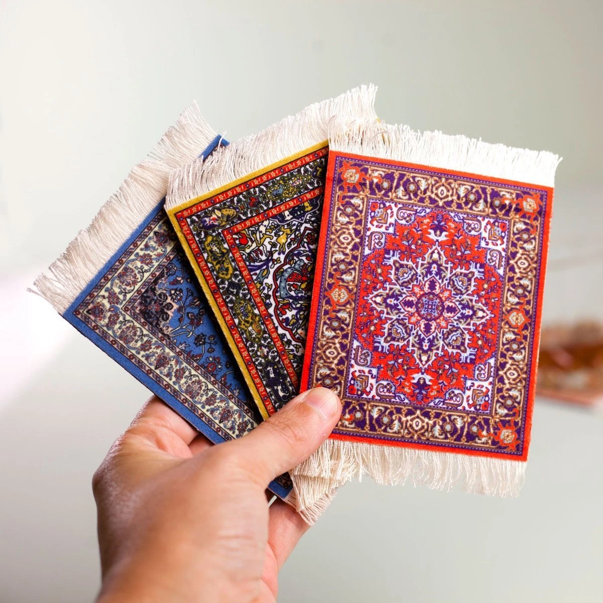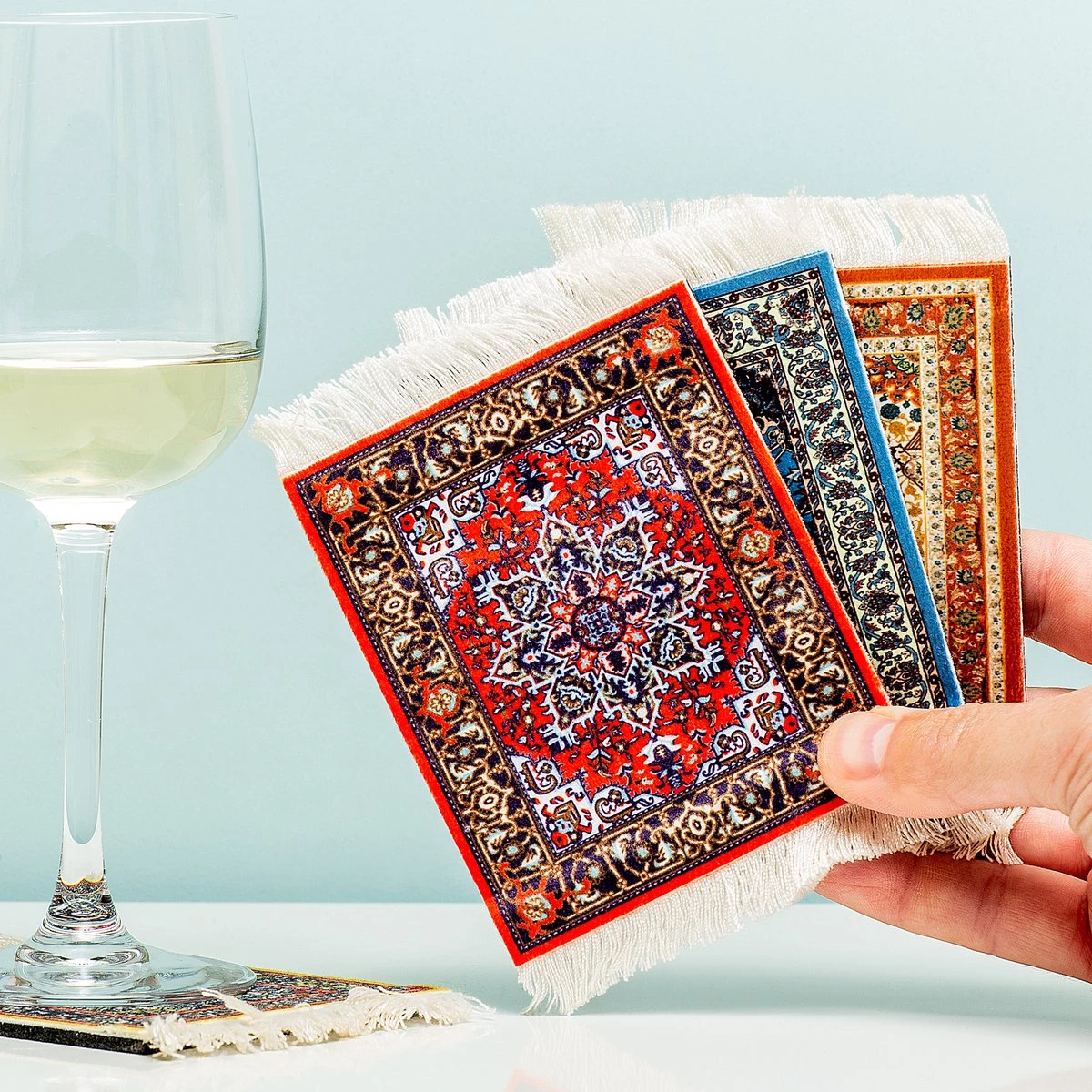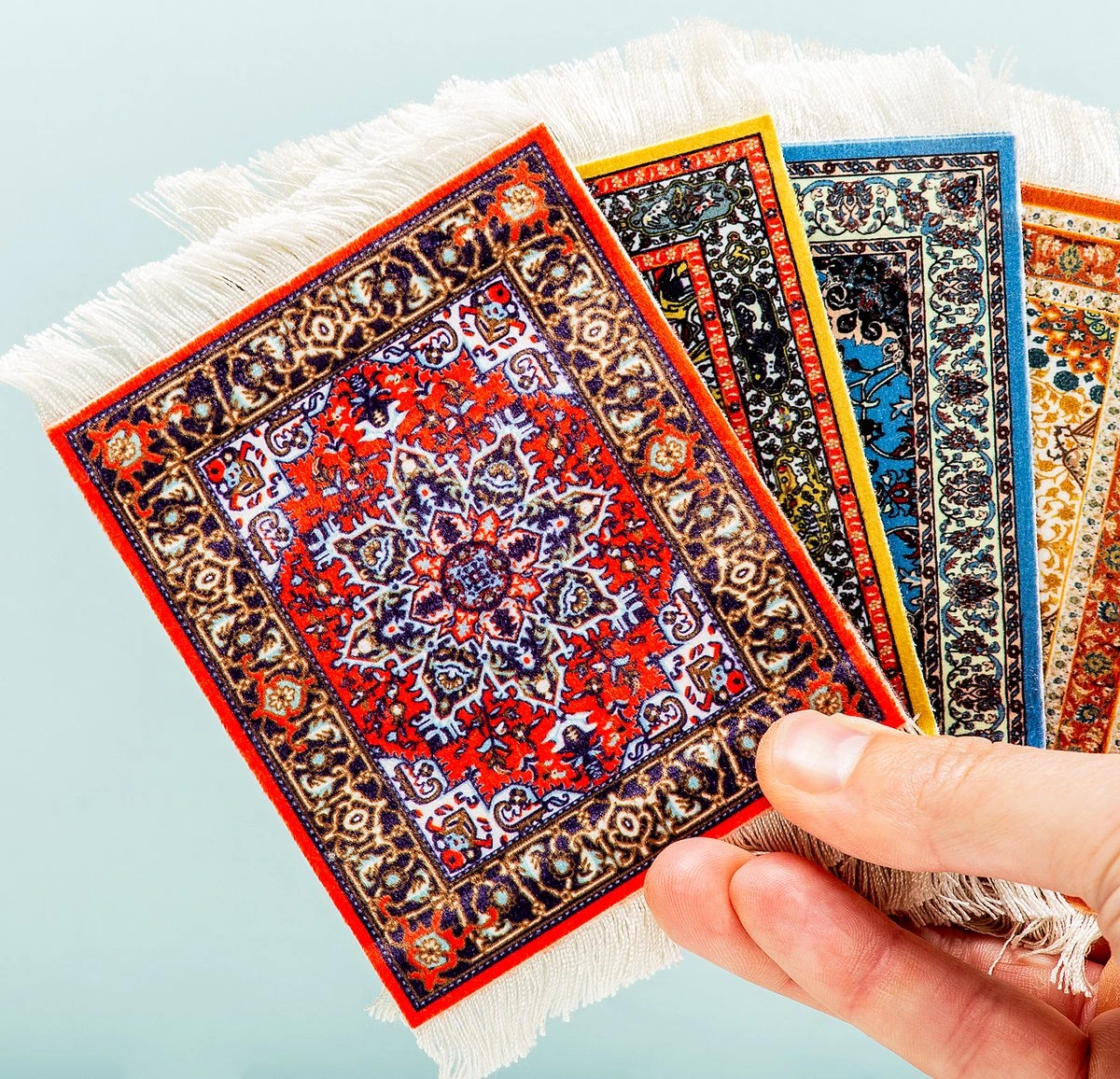 Perzisch tapijt onderzetters van Invotis. Onderzetters die eruitzien als Perzisch tapijt. In de set zitten vier onderzetters met elk in een ander motief en kleur. De tapijt onderzetters zijn gemaakt van stof en rubber en kunnen op de hand worden uitgewassen. De onderzetters beschermen de tafel tegen kringen, vlekken en krassen van glazen en mokken. Zorgt voor een kleurrijke toevoeging in de woonkamer. Afmeting: 13 x 9 centimeter.