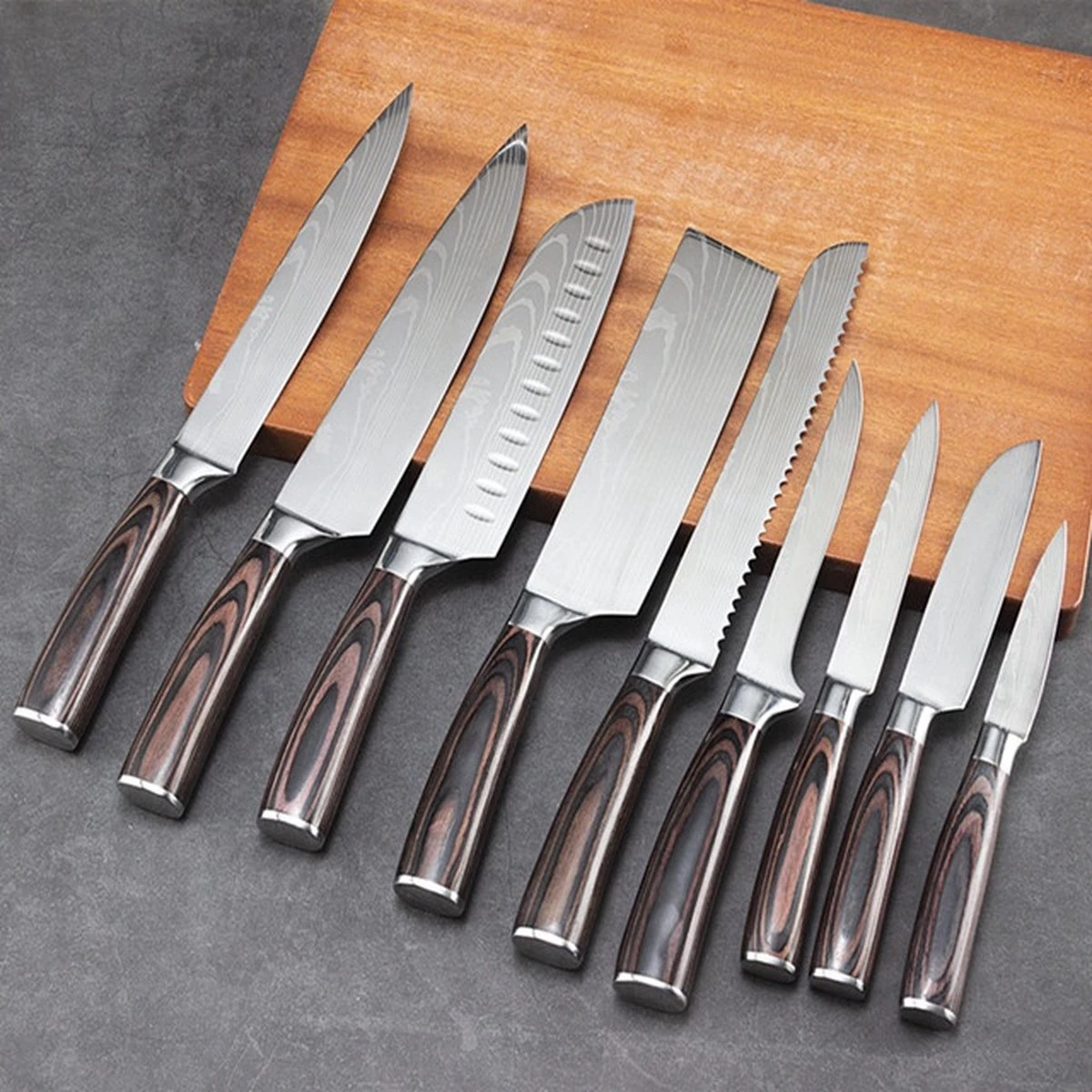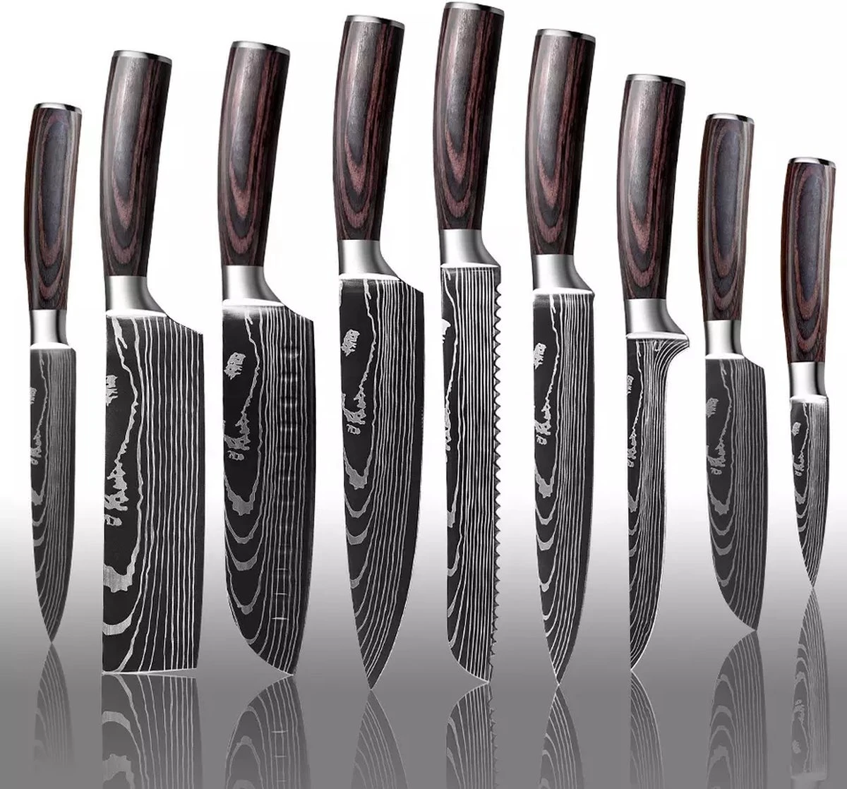 – 1x Santokumes (31 cm) voor plakjes en dobbelsteentjes snijden, maar ook fijnsnijden.