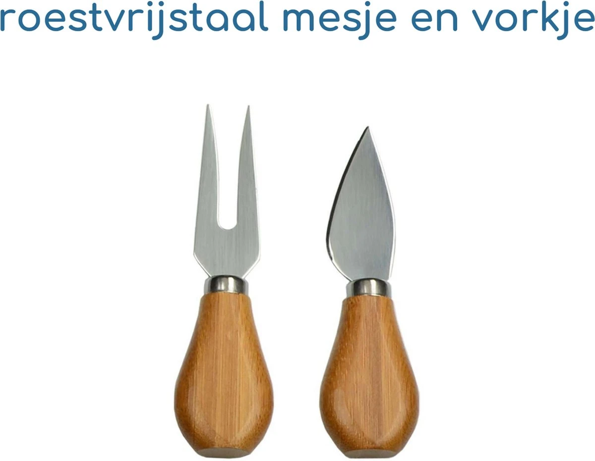 In de doos zit een in elkaar geschoven bamboe kaasplank met een kaasmesje en een vorkje, beide van rvs.
