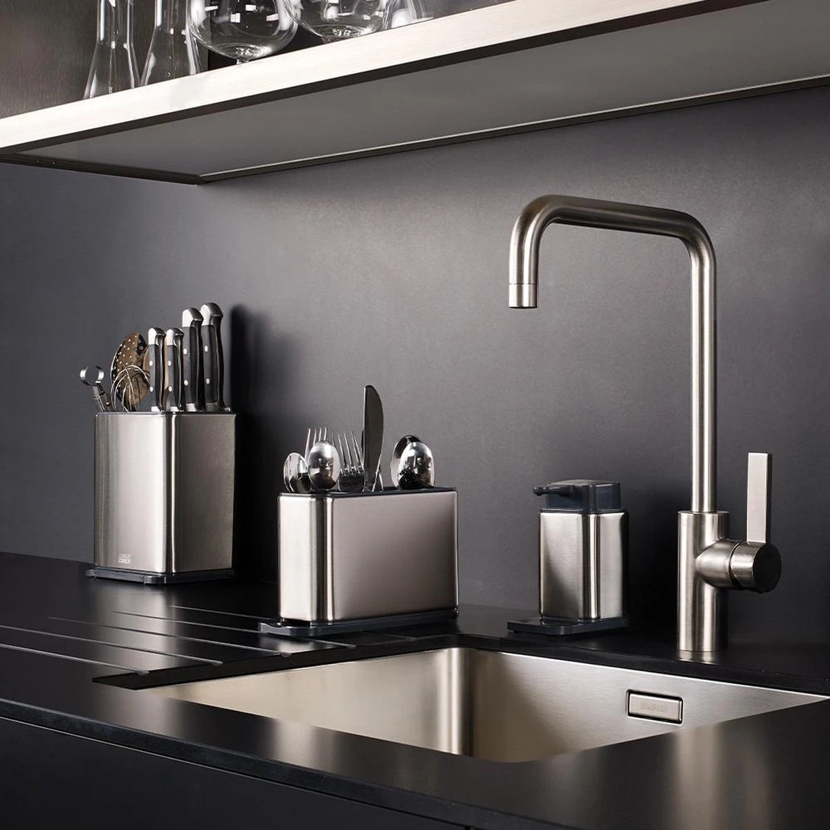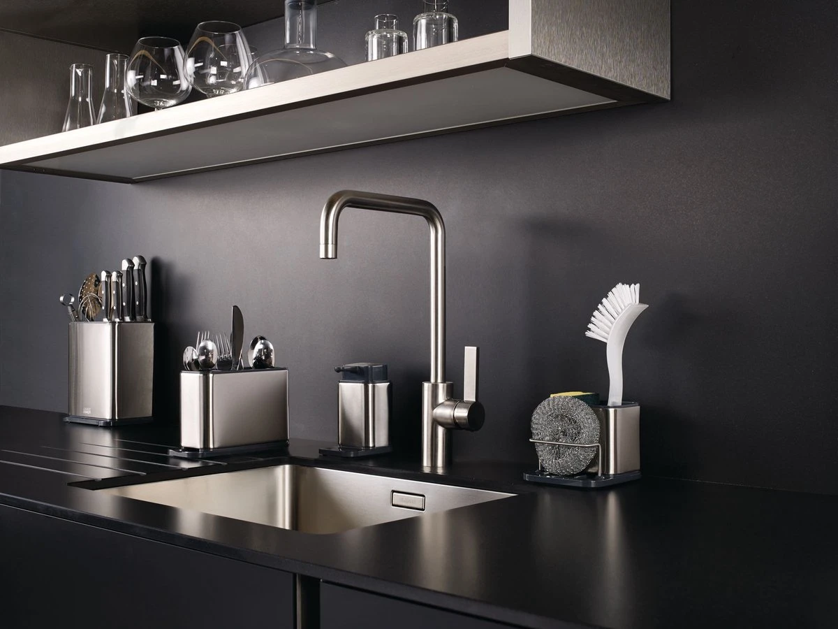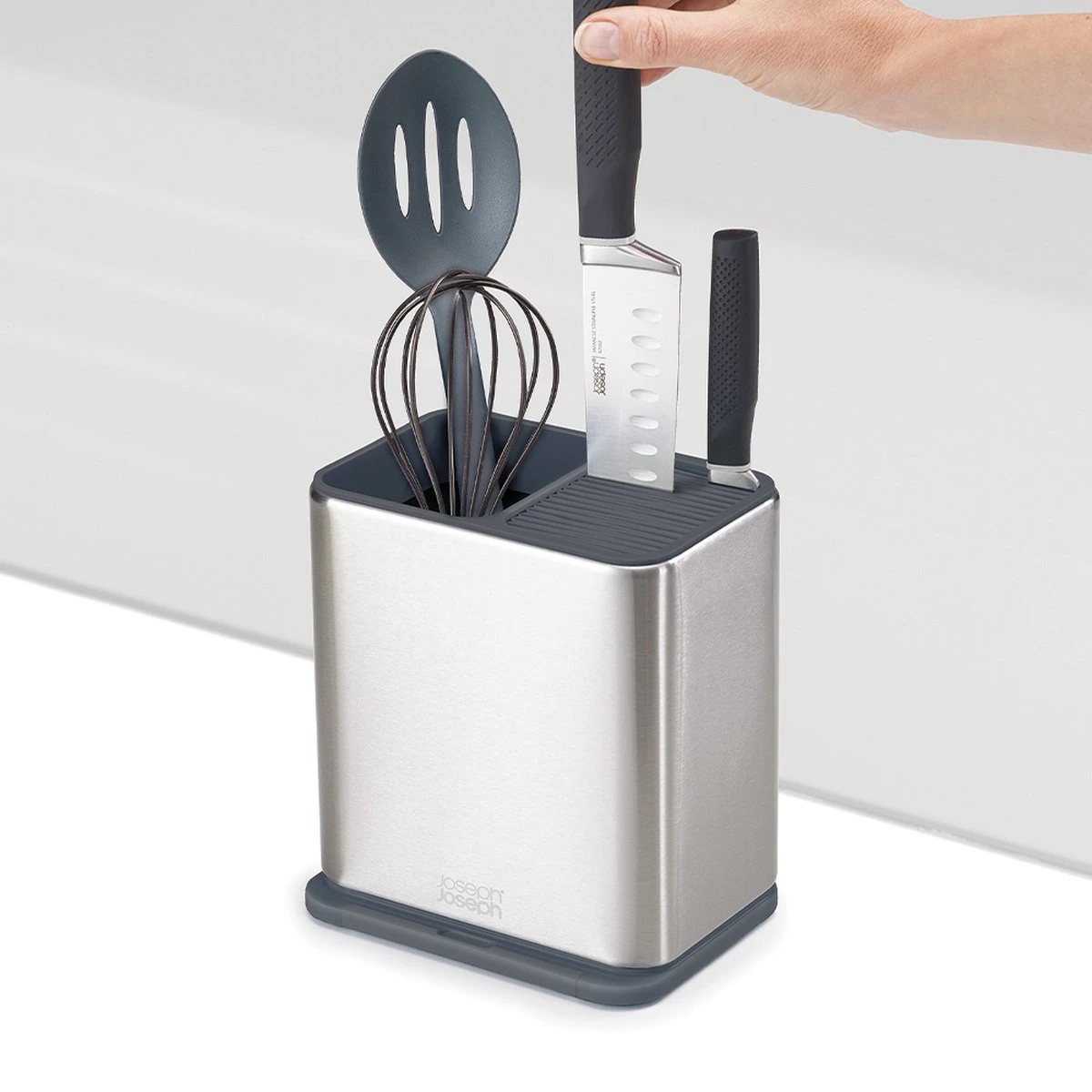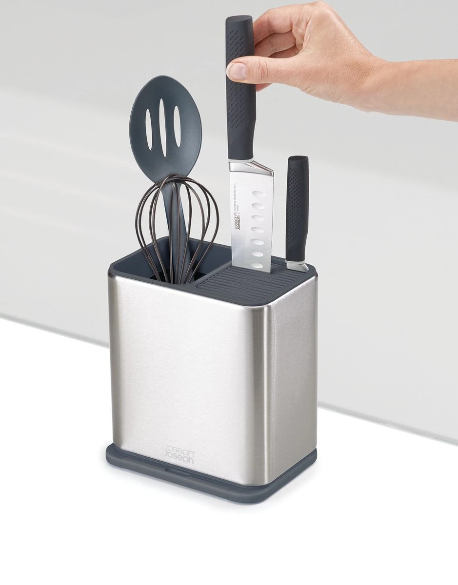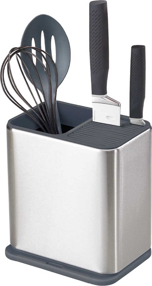 Keukenhulphouder en messenblok in één. Aan de linkerkant is ruimte voor keukenhulpen met een lang handvat. Aan de rechterkant berg je messen veilig op in de sleuven. Aan de onderkant zit een lepellegger verborgen.