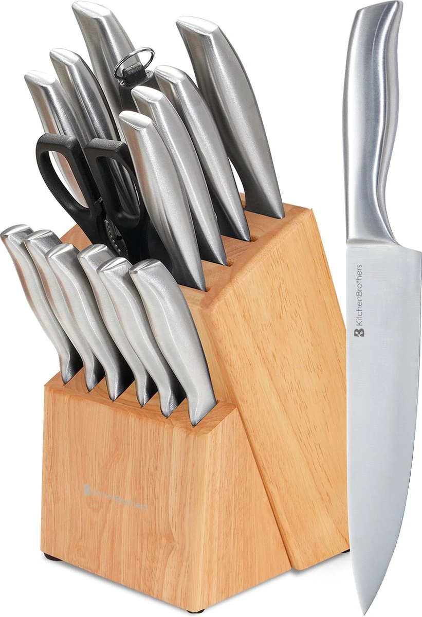 De 16-delige messenset van KitchenBrothers bestaat uit 13 keukenmessen, een keukenschaar, een dunschiller, een messenslijper en een messenblok: