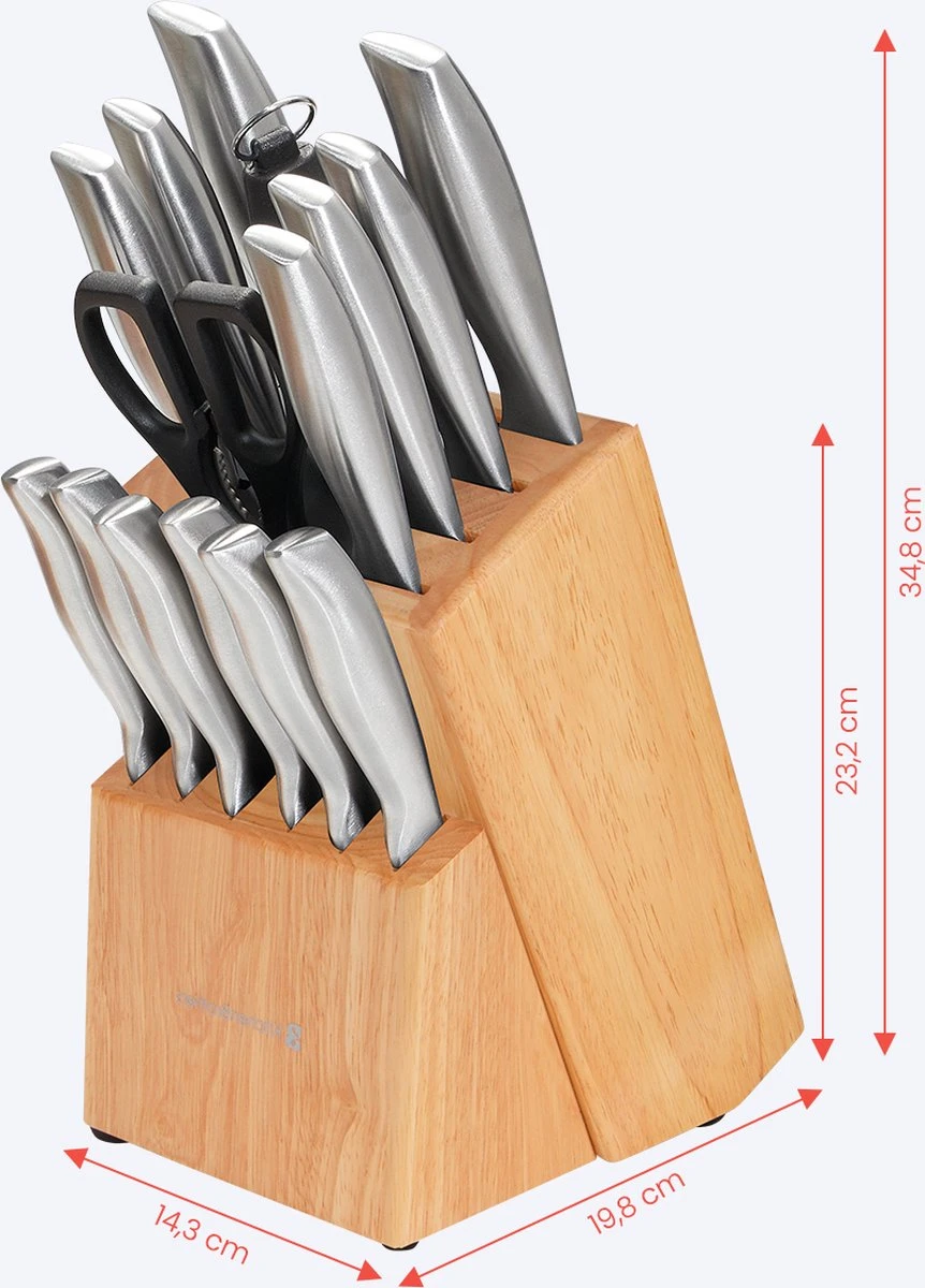 - Inhoud verpakking: 13x Keukenmes – 1x Keukenschaar – 1x Slijpstaaf – 1x Messenblok