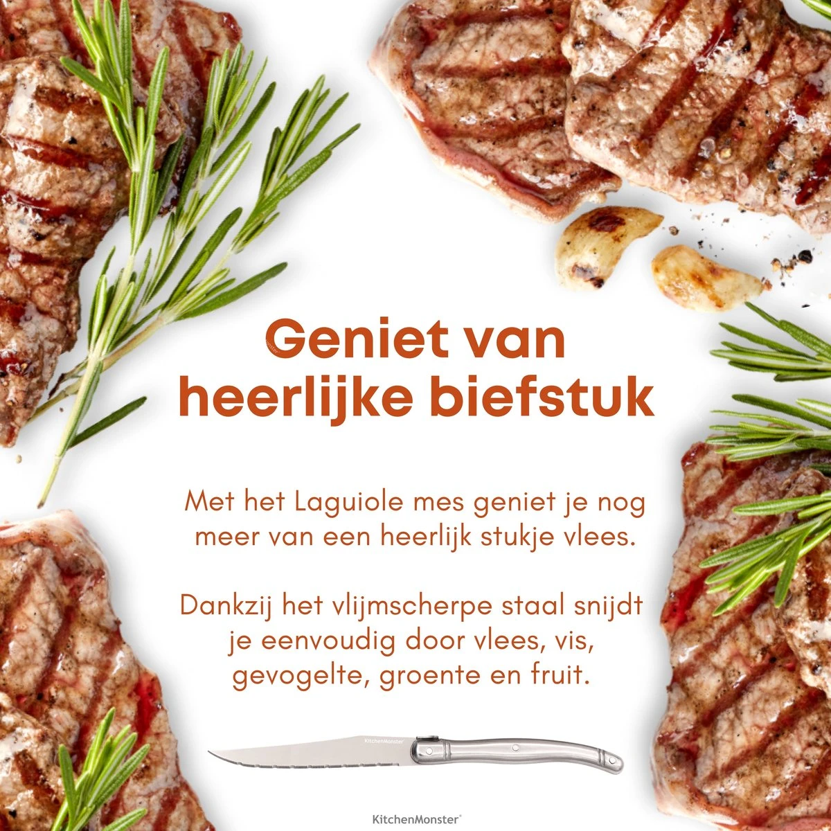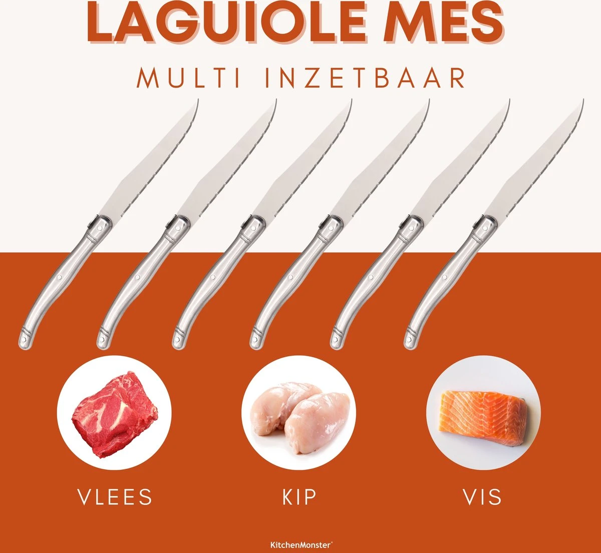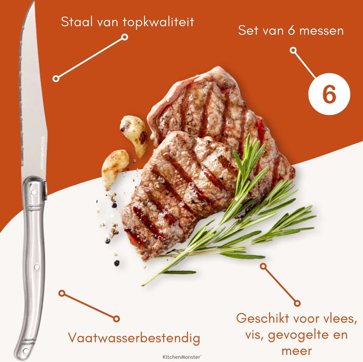 Het Laguiole steakmes van KitchenMonster is gemaakt van hoogwaardig staal dat gemaakt is om jaren mee te gaan. De messen zullen dan ook niet gaan roesten en hebben een lange levensduur. Dankzij de hoge kwaliteit blijft het mes altijd vlijmscherp en kan je soepel door alle soorten vlees snijden. Het handvat van het mes is gemaakt van RVS.