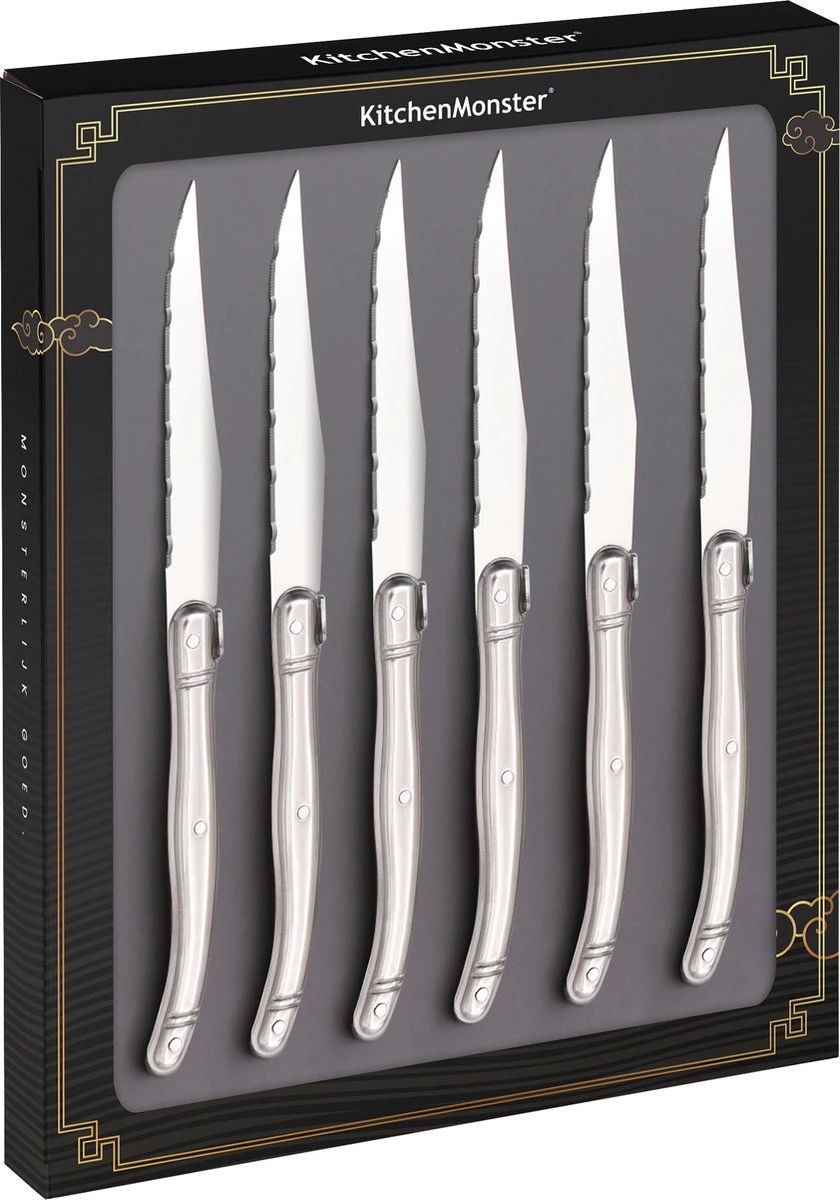 Ben je opzoek naar een hoogwaardig en kwalitatief steakmes om door een heerlijk sappige biefstuk te snijden? Dan is een KitchenMonster Laguiole Steakmes ideaal voor jou! Dit steakmes maakt het snijden van jouw steaks een eitje dankzij het super scherpe staal en heeft bovendien een prachtig design.