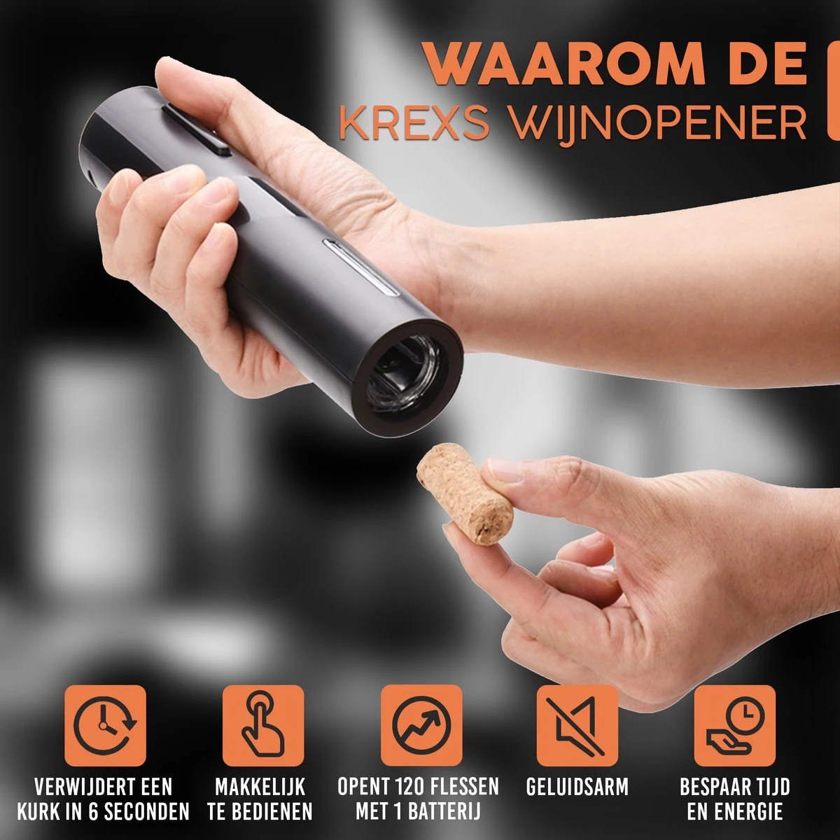Bestel de Krexs Elektrische Wijnopener vandaag, en wij betalen de verzendkosten! Wij geloven heilig in de kwaliteit van onze producten, daarom hanteren we 30 dagen kosteloos retourneren. Dit is een must have voor iedere wijnliefhebber!