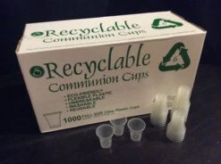 Our reusable communion cups are the result of years of experience and testing and can be used upto 6 times. These economical clear plastic cups are designed to fit standard cup trays and give you a more environment friendly alternative without the worry of breakage. The flared cup rim is designed for easy handling. The lightweight plastic eliminates the worry of handling heavy trays and the cups are disposable or recyclable, which reduces the long hours of cleanup time. Each cup is 34 mm high and 32 mm wide. The cups holds 10-15 ml of liquid. Cups are stacked and wrapped in plastic sleeves of 50 cups each (juice not included).
