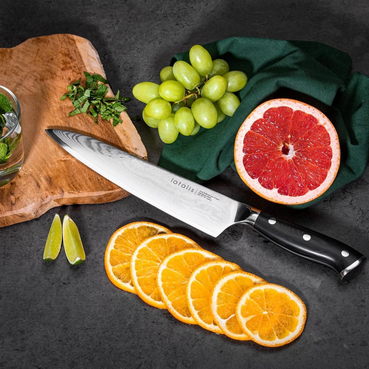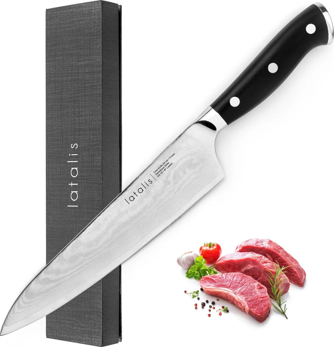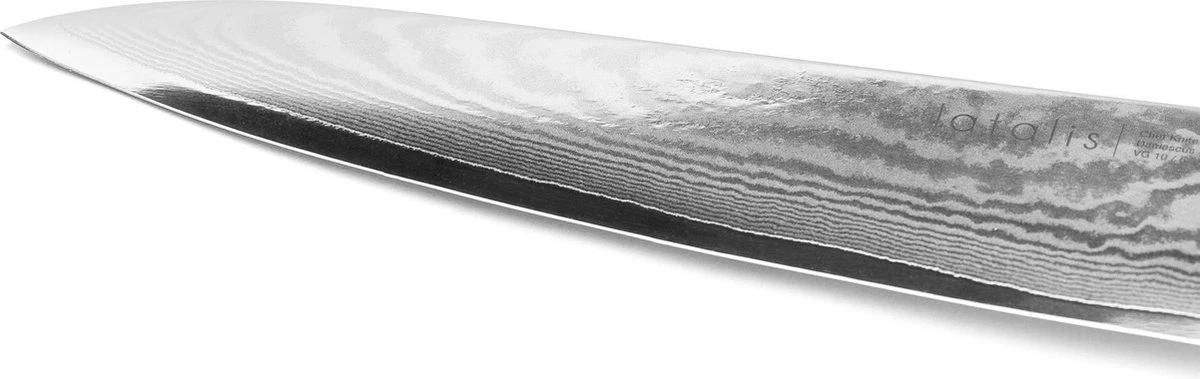 Altijd al een mooi en kwalitatief koksmes willen kopen voor in uw keuken? Ga dan voor het Latalis Damascus mes, een van origine ontworpen Japans koksmes met een lemmet dat bestaat uit 67 hoogwaardige lagen roestvrij VG10 damaststaal.