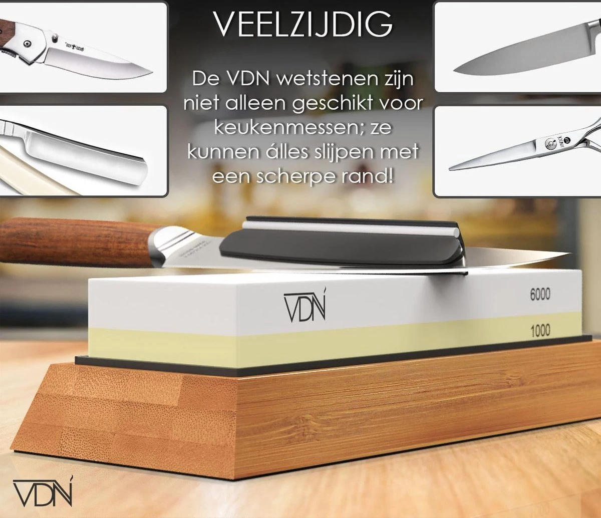 De universele wetsteen is niet alleen geschikt voor keukenmessen: De VDN-slijpsteen helpt u niet alleen om scherpere keukenmessen te krijgen. Gebruik het voor het slijpen van zakmessen, vleesmessen, jachtmessen, tuinscharen, scheermesjes of andere messen. De slijpsteen is veelzijdig en kan gemakkelijk zowel binnenshuis en buitenshuis worden gebruikt.