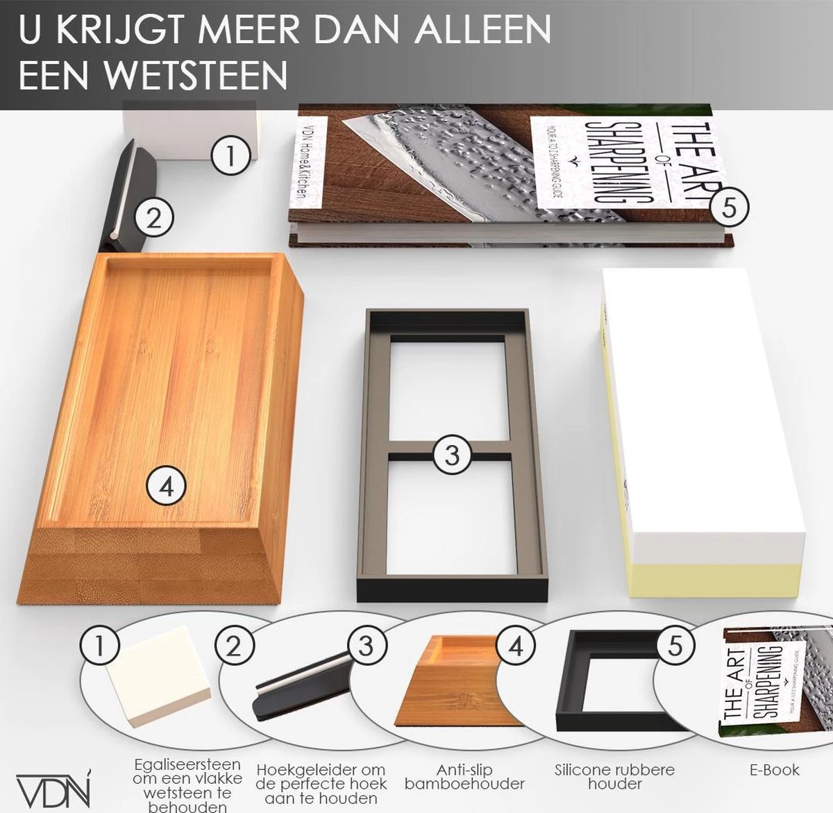 Inhoud: 1 wetsteen, 1 hoegbegeleider, 1 antipslip mat, 1 bamboehouder met anti-sliplaag en een uitgebreide uitleg dmv e-book.