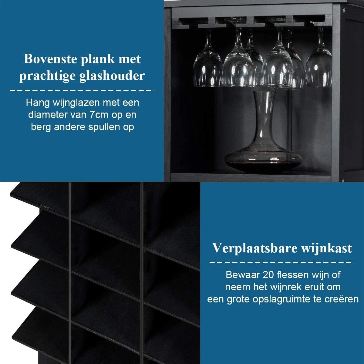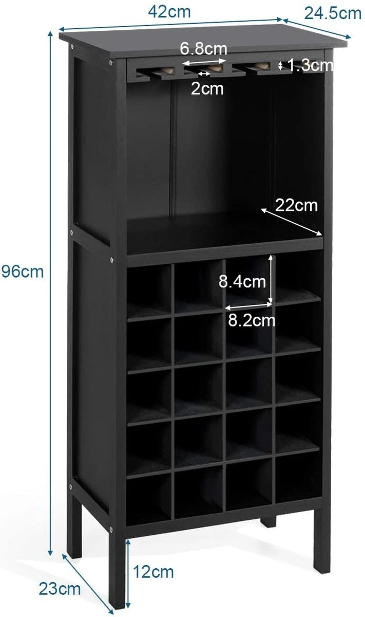 - 【Bovenkant Glazenhanger & Extra Kastje】Dankzij de wetenschappelijke indeling is ons wijnrek uitgerust met 4-rijige glazenhangers voor het ophangen van uw glazen, waardoor de verticale ruimte volledig wordt benut. En onder de glashanger bevindt zich een ruime kast om andere voorwerpen in op te bergen.