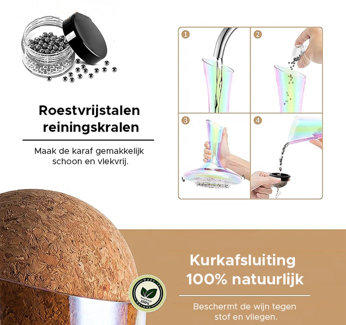 Het schoon houden van een luxe decanteer karaf is uiterst belangrijk, want je wilt zo hygiënisch mogelijk van de karaf kunnen genieten. Dit product heeft een speciale wijze van reiniging nodig. Bij dit product zitten de benodigde schoonmaak benodigdheden. Dit in de vorm van (1.000) schoonmaakparels.