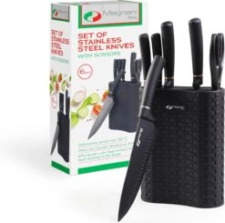 Met deze messenset heb je voor elke situatie het juiste mes bij de hand. De messenset komt inclusief een schaar en een handige houder om alles gemakkelijk bij elkaar te houden. De houder is zwart met een gewoven relief en oogt minimalistisch. De houder kan je dus overal in je keuken plaatsen. Na een uitgebreide kooksessie geen zin meer in afwassen? De messen zijn vaatwasmachinebestendig tot 60 °C.