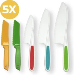 Wil je samen met de kids veilig koken? Of wil je de zelfstandigheid van het kind bevorderen? Hiervoor heeft Mamboe een 5-delige kindermessen set ontwikkeld! Dankzij de kunststof kartelrand is het mogelijk groentes, fruit en brood op een veilige manier te snijden. De set wordt geleverd in verschillende vrolijke kleuren en is vaatwasserbestendig. De perfecte mensen om samen met de kids te koken!