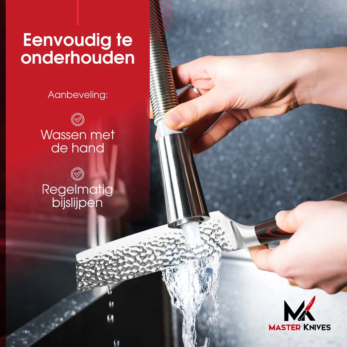 Let op, wij raden aan het koksmes met de hand schoon te maken. Doe het mes niet in de vaatwasser. Ook willen wij aanraden je nieuwe aanwinst regelmatig te slijpen.